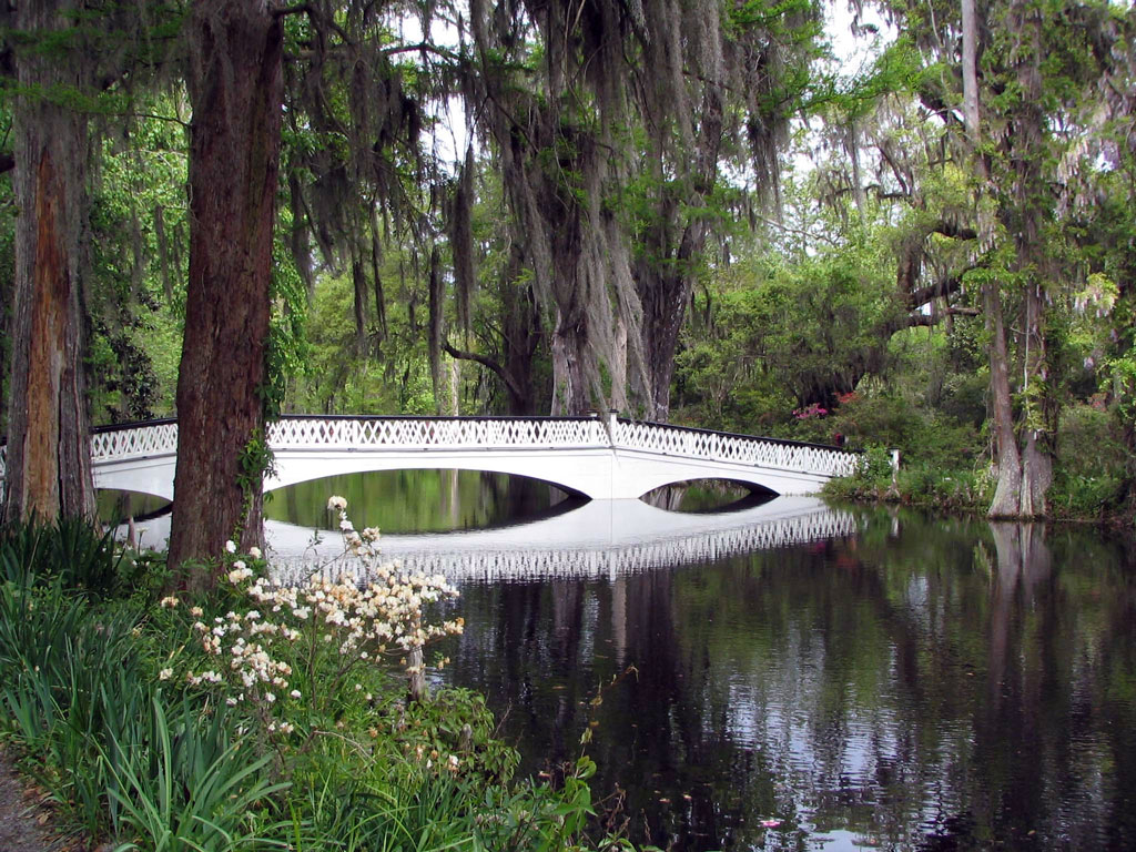 Description: A bridge over a river with a white bridge in the middle of it and trees around it and flowers on the side.