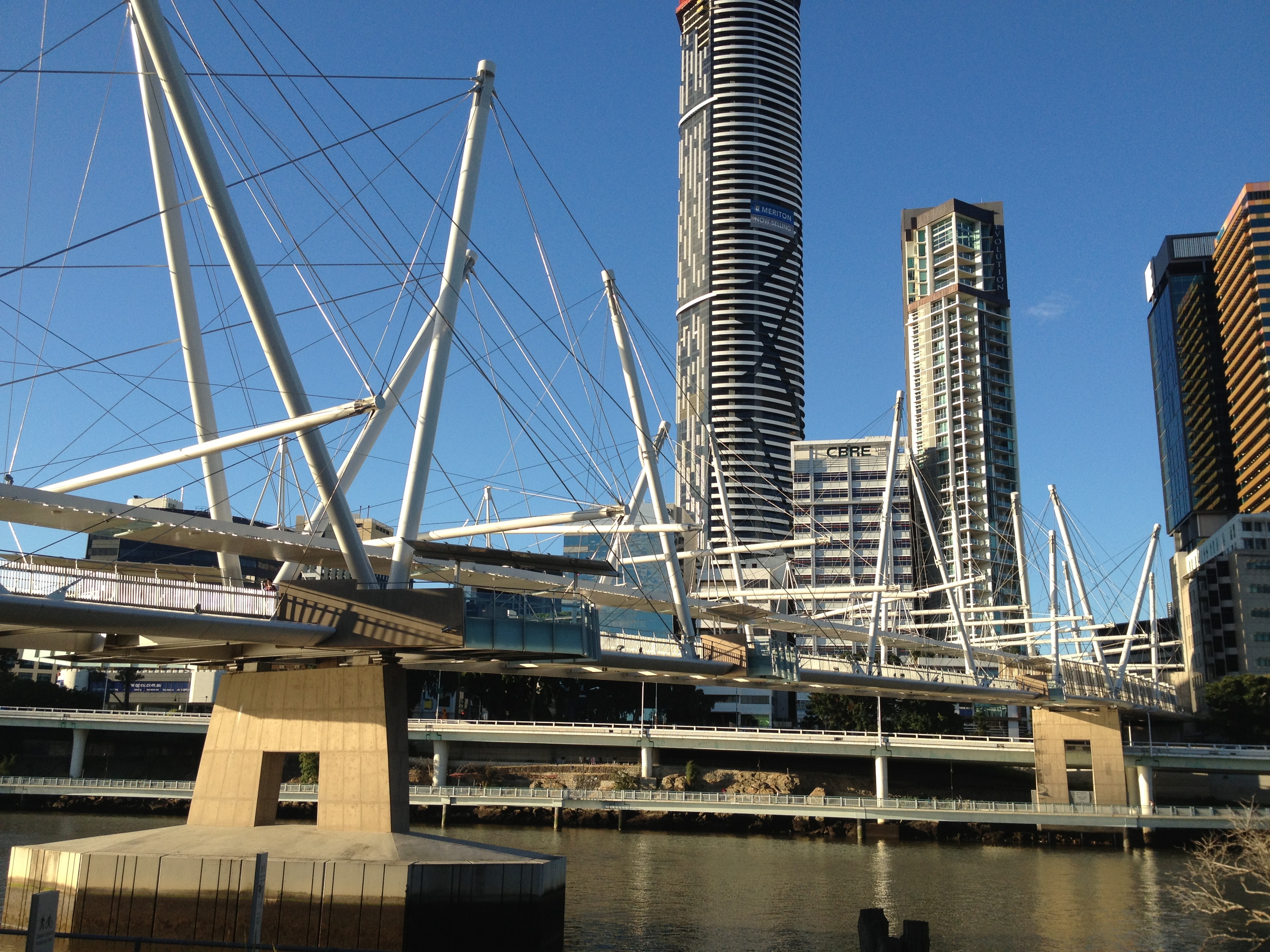 Description: A bridge with a train going over it and a tall building in the background with a blue sky in the background.