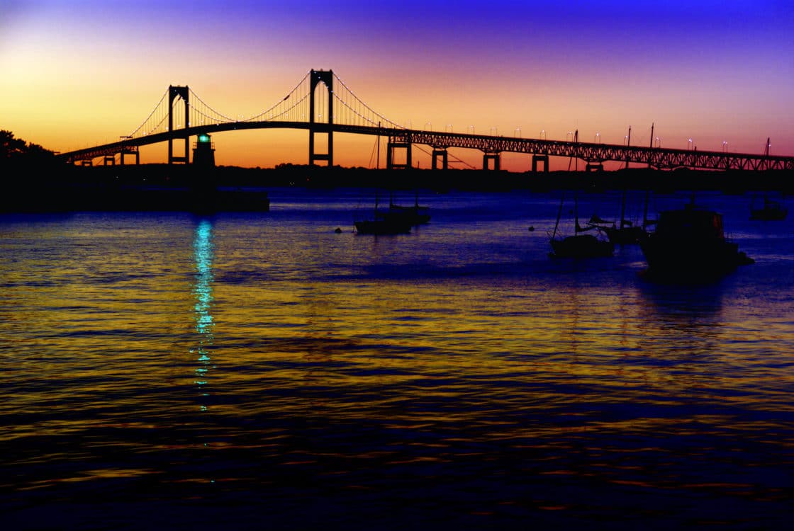 Description: A bridge over a body of water with boats in it at sunset or dawn with a blue sky and a yellow and purple hue.