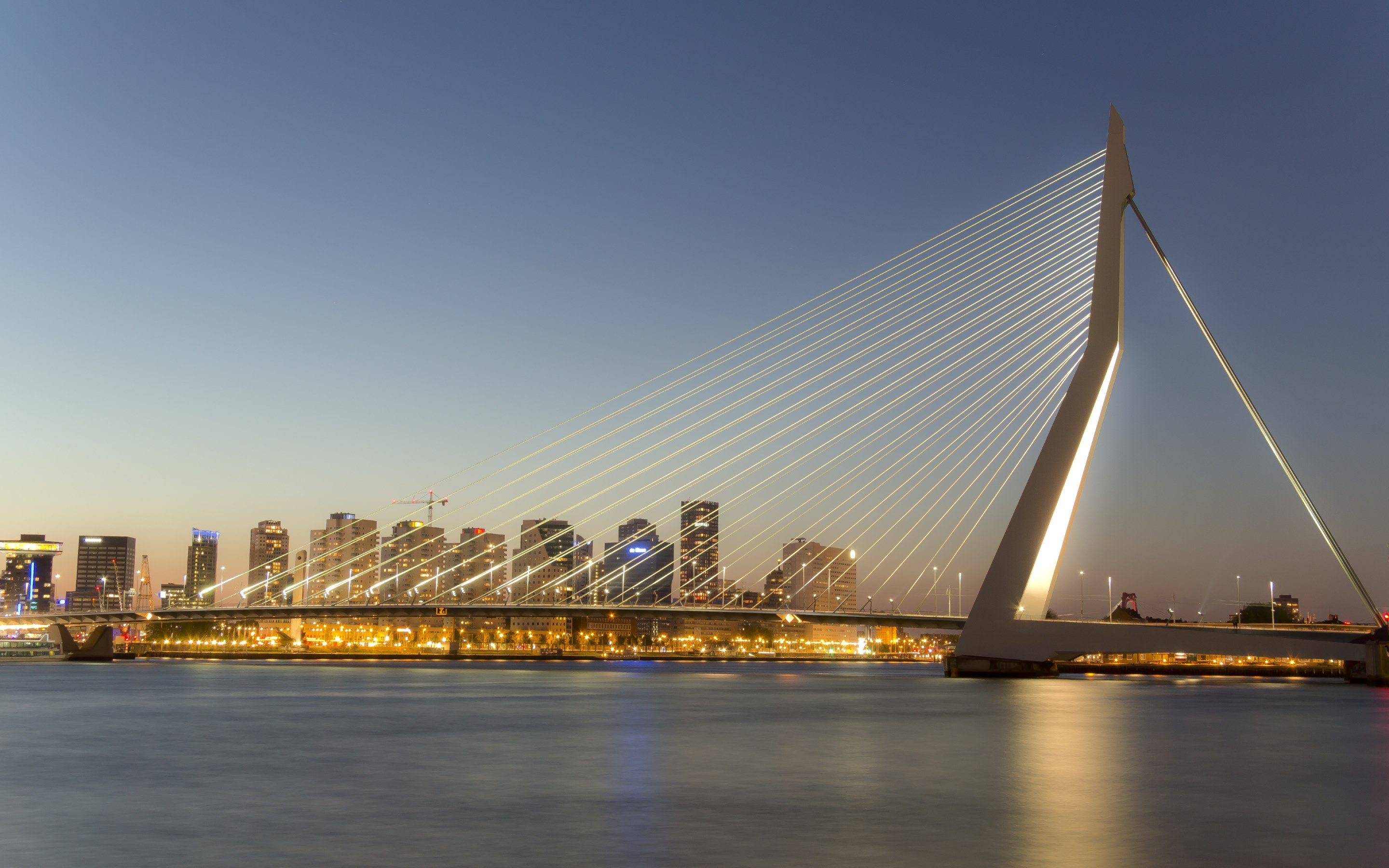 Description: A bridge over a body of water with a city in the background at night time with lights on the bridge.