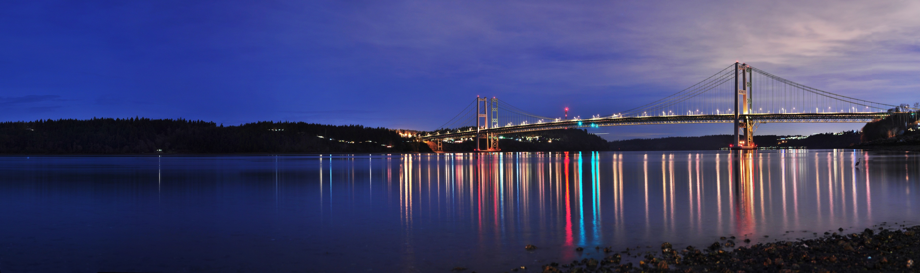 Description: A bridge that is over a body of water at night time with lights on it and a few clouds in the sky.
