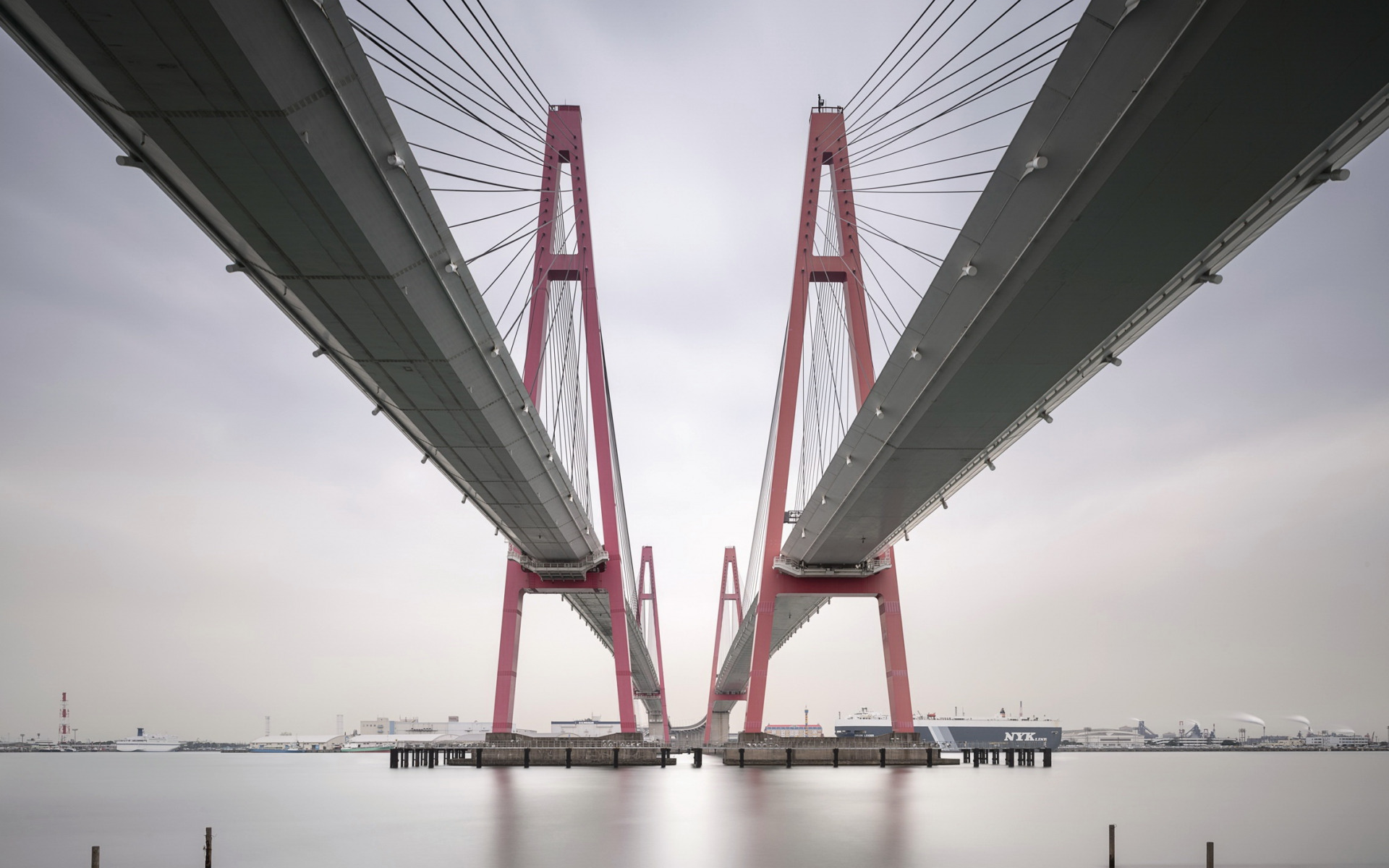 Description: A large bridge spanning over a body of water with a sky background and a few clouds in the sky.