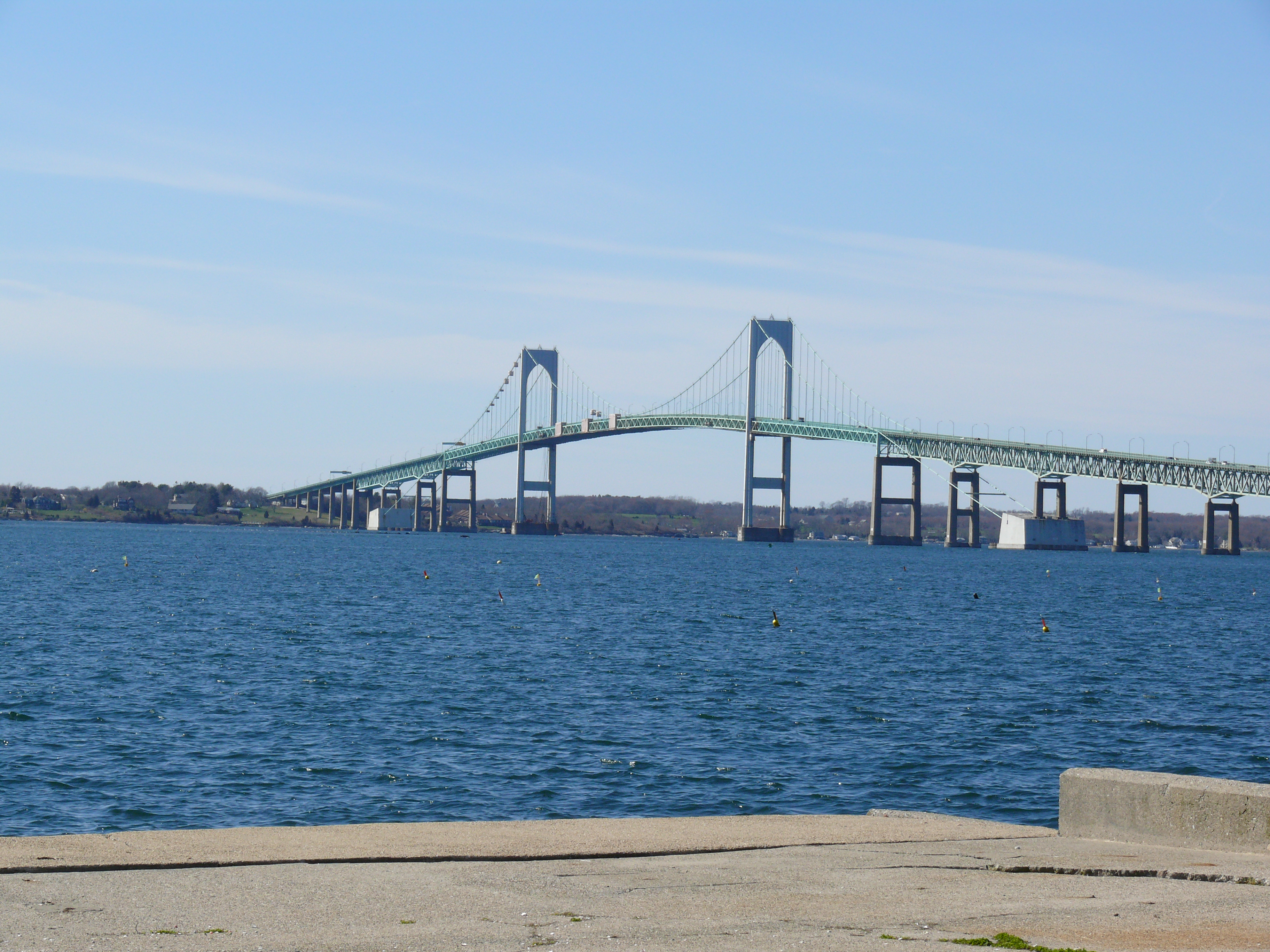 Description: A bridge over a large body of water with a sky background and a concrete platform in the foreground.