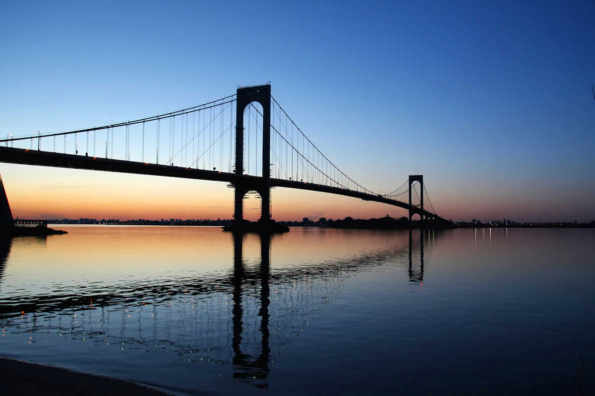 Description: A bridge that is over water at sunset or dawn with a reflection of the bridge in the water and the sky.