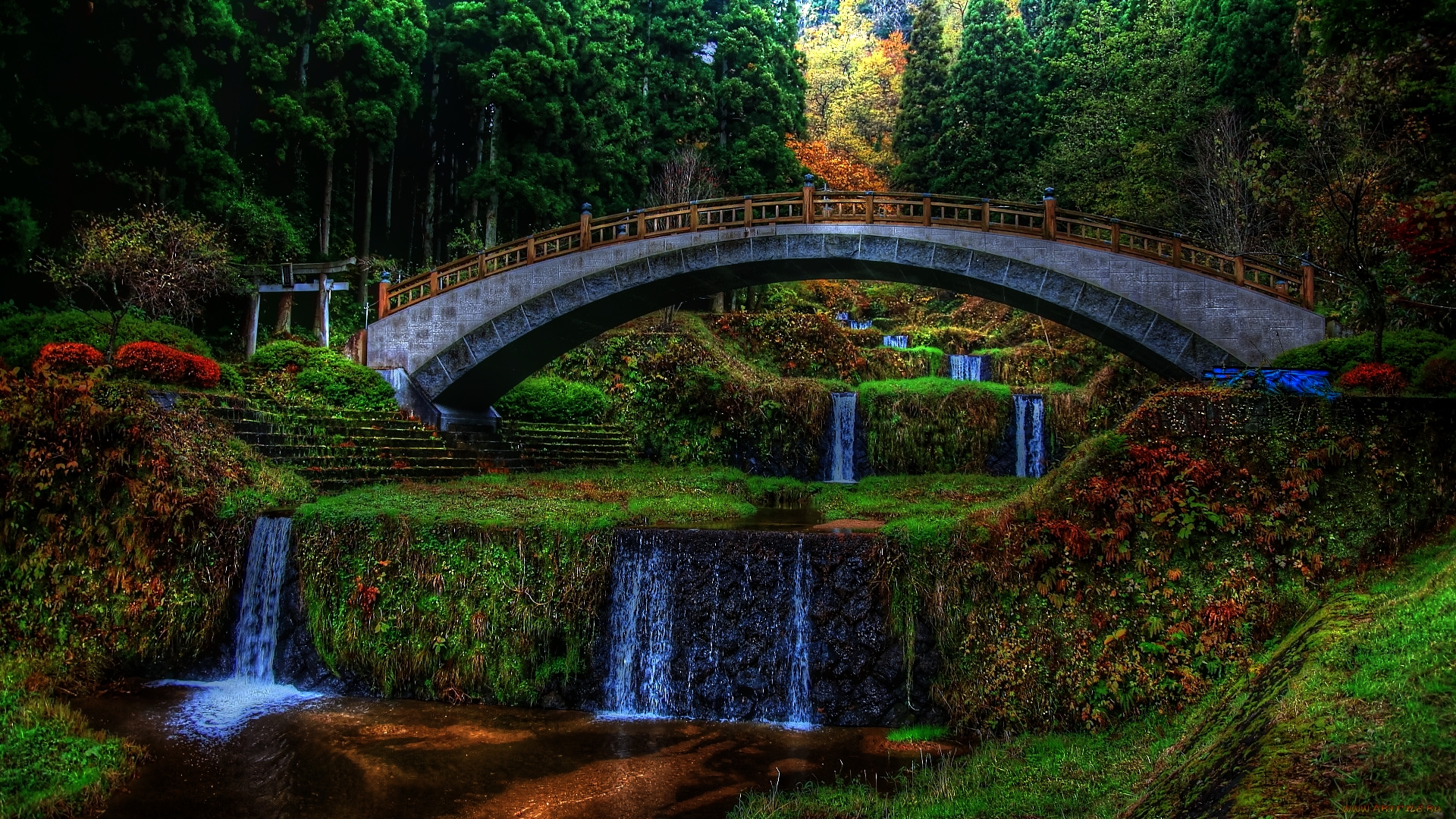 Description: A bridge over a small waterfall in a forest with a waterfall below it and a waterfall below it.
