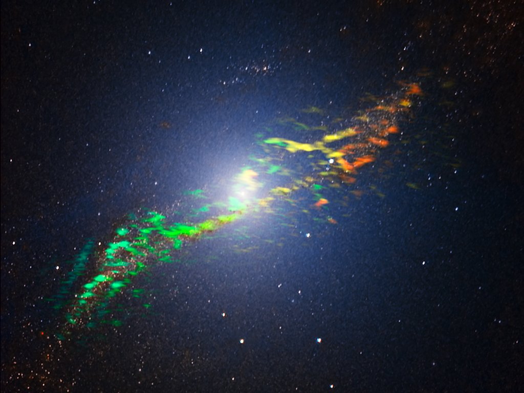 Description: A very bright green object in the sky with stars around it and a bright green object in the middle of the picture.