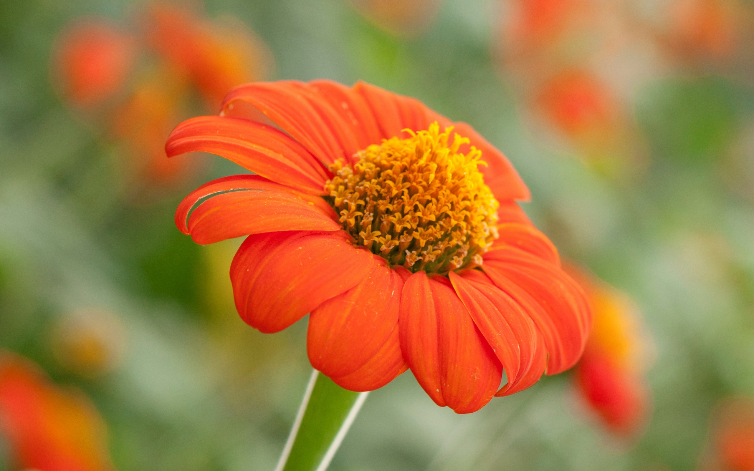 Description: A bright orange flower with a yellow center in a field of orange flowers with green stems and leaves in the background.