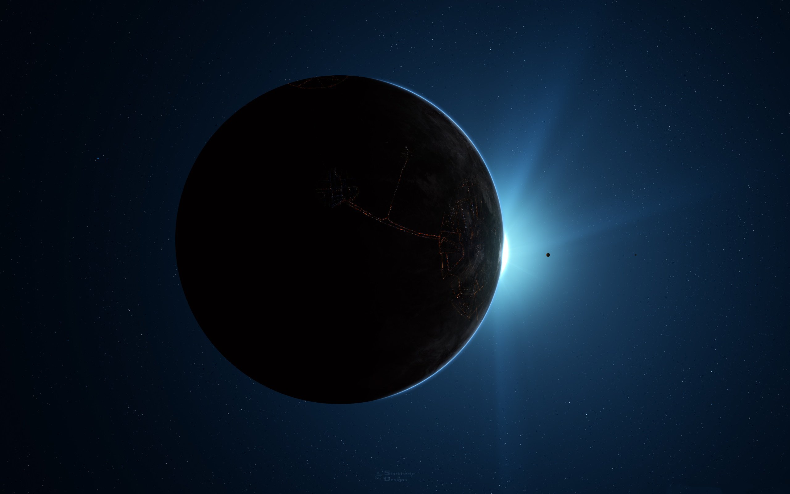 Description: A bright sun shines brightly behind a dark planet in the sky with a small object in the foreground.