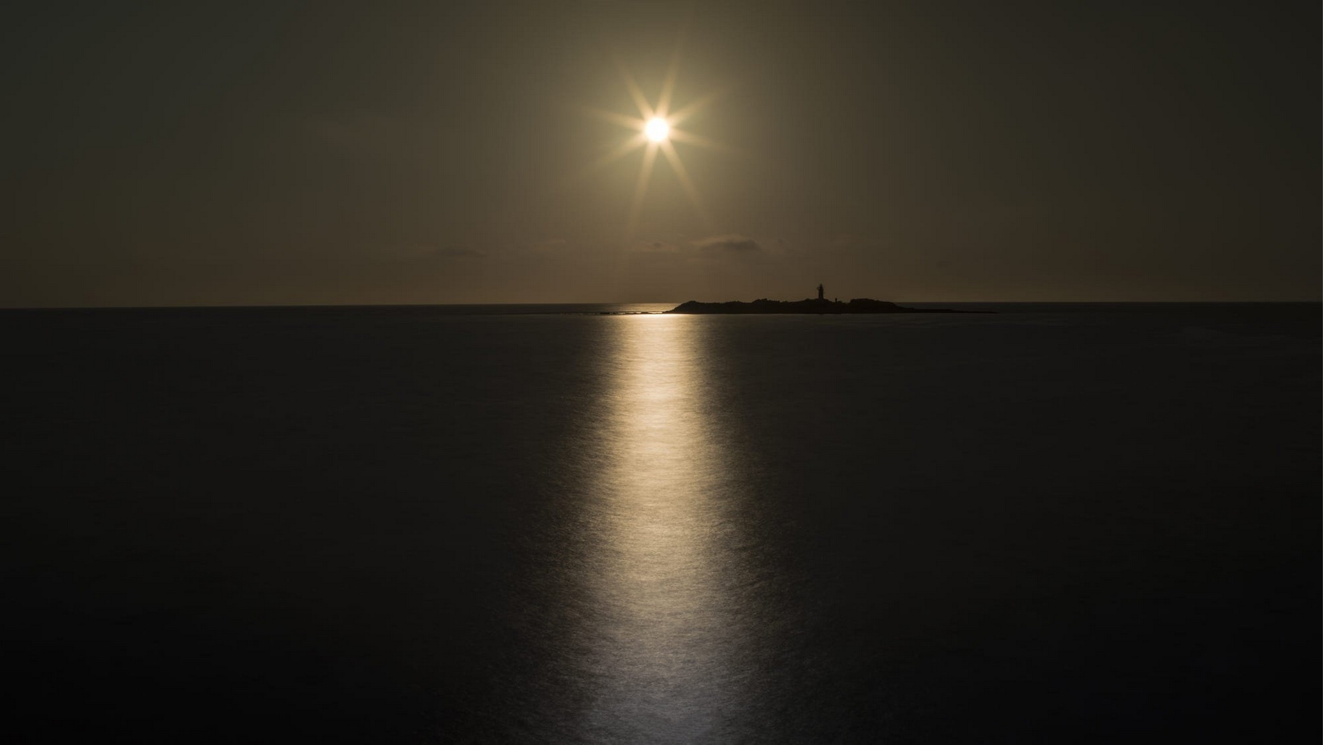 Description: A bright sun shines brightly over the ocean at night with a lighthouse in the distance in the distance.
