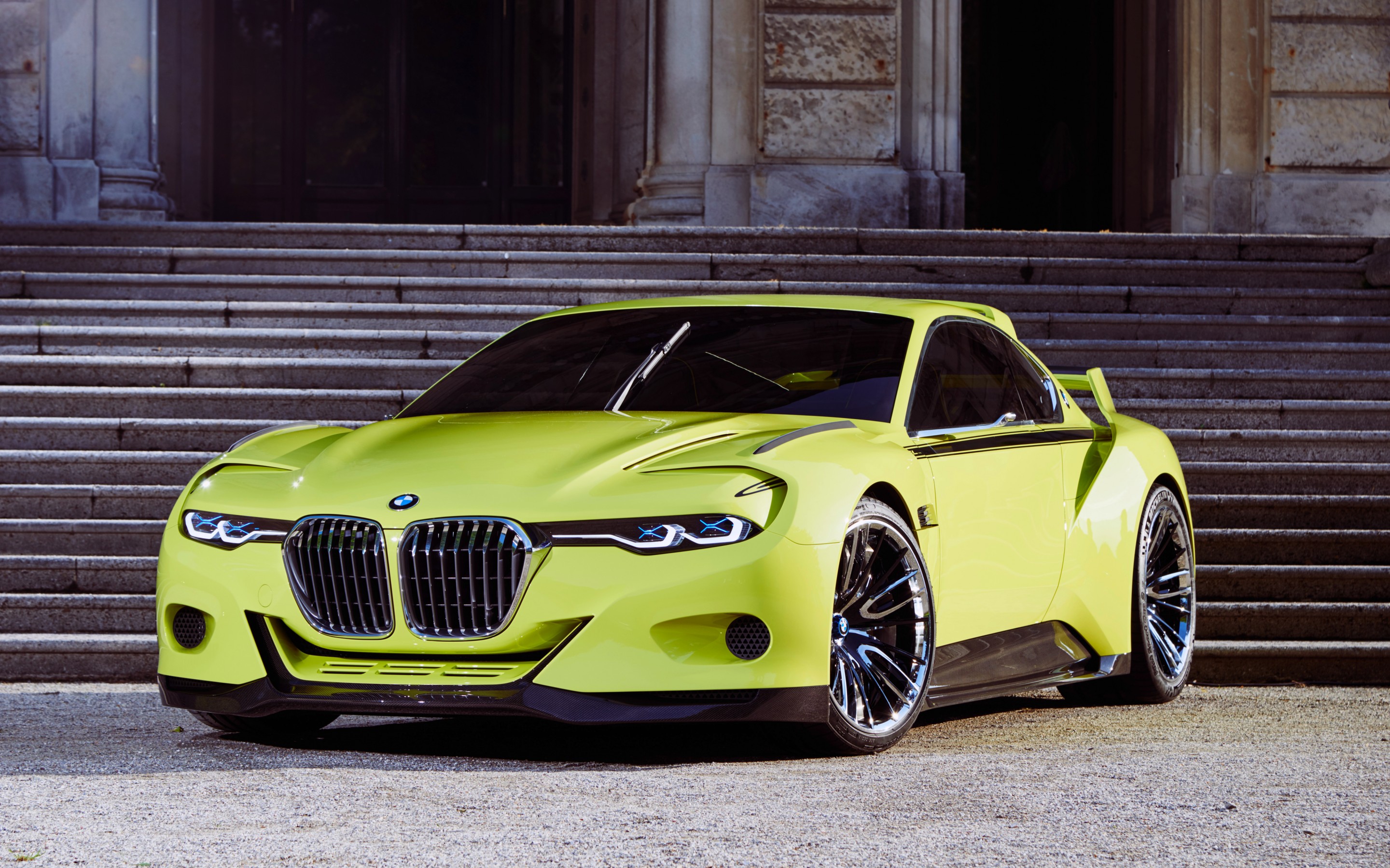 Description: A bright yellow bmw concept car parked in front of a building with steps leading up to it's entrance.