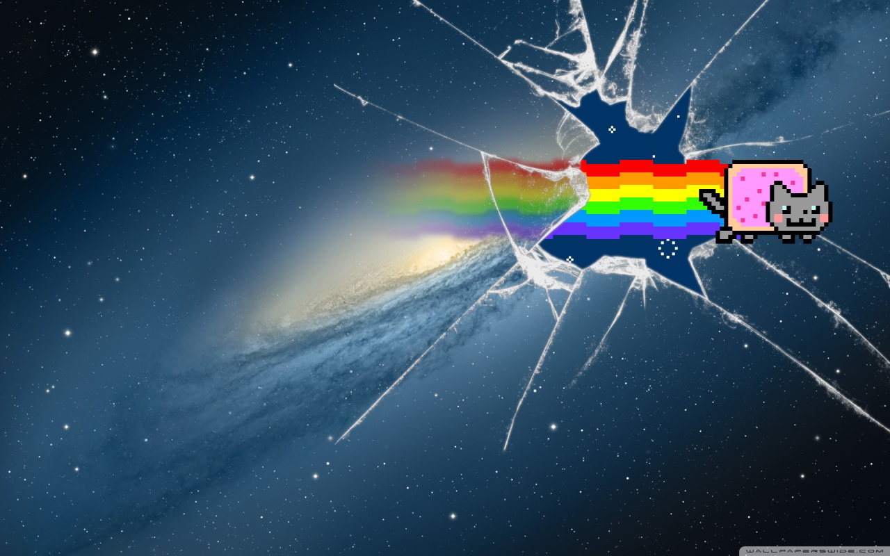 Description: A broken glass with a rainbow in the middle of it and a cat on the side of it with a rainbow in the middle.
