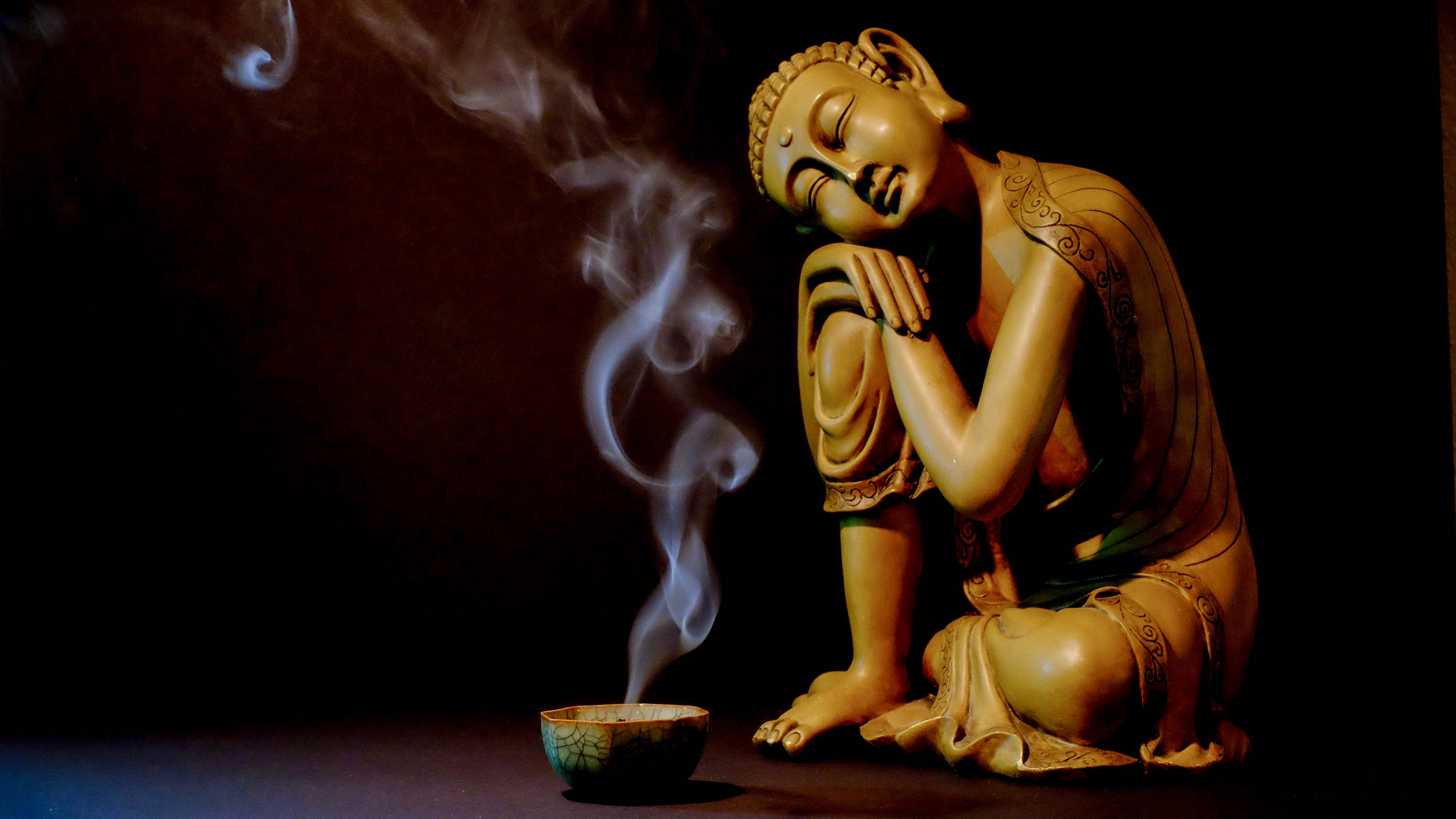 Description: A statue of a person sitting next to a bowl of smoke and a bowl of food on a table.