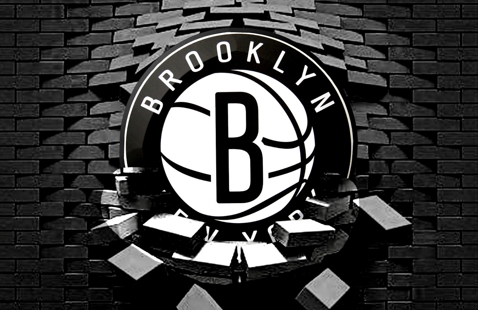 Description: A black and white photo of a brooklyn basketball logo on a brick wall with a black and white checkered pattern.