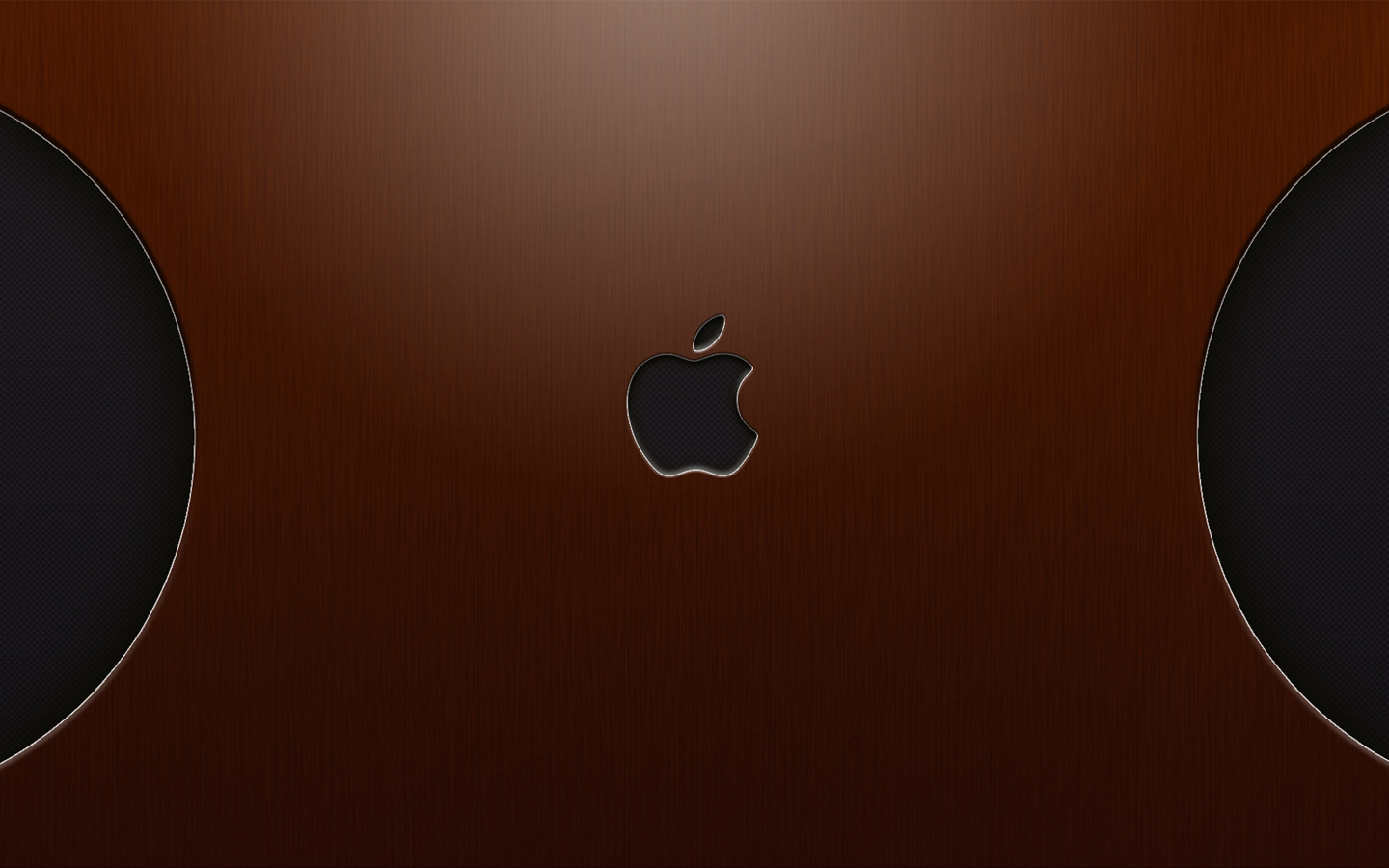 Description: A brown apple logo on a wooden surface with a black background and a black circle around it that is part of a brown apple.