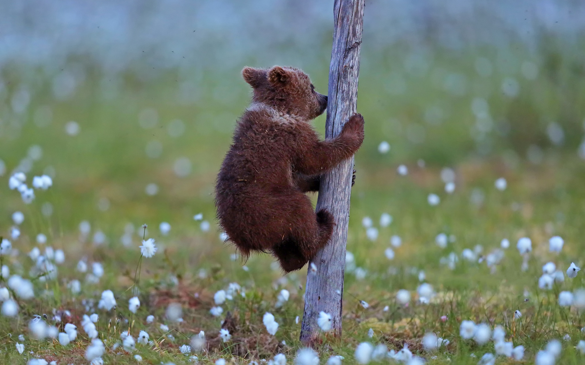 Description: A brown bear climbing up a wooden pole in a field of flowers and grass with a blue sky in the background.