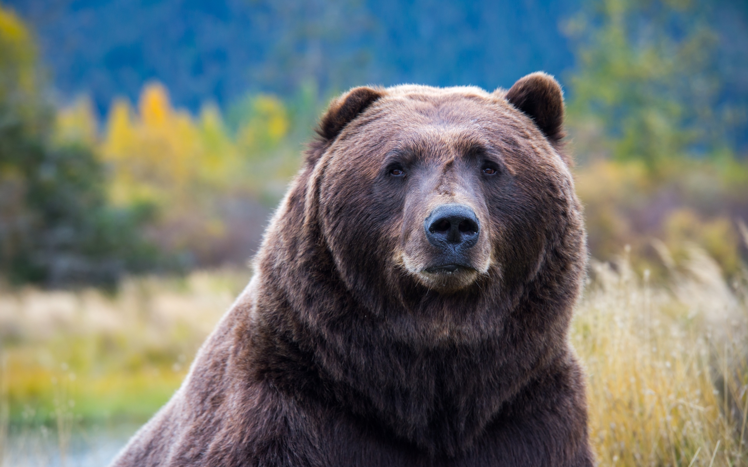 Description: A large brown bear standing in a field of tall grass and trees in the background.