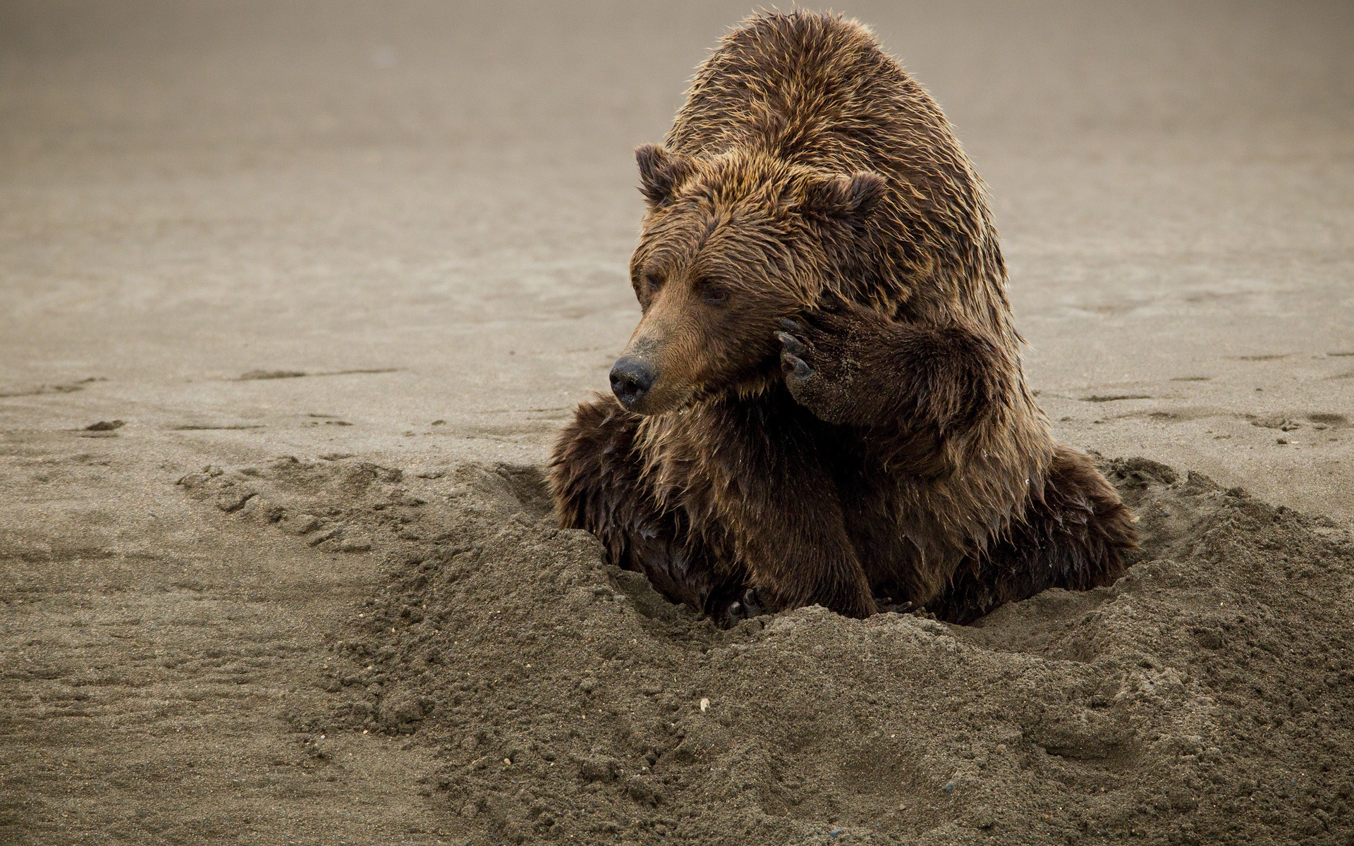 Description: A brown bear sitting in the sand on a beach with its head in the sand and it's paw in the sand.
