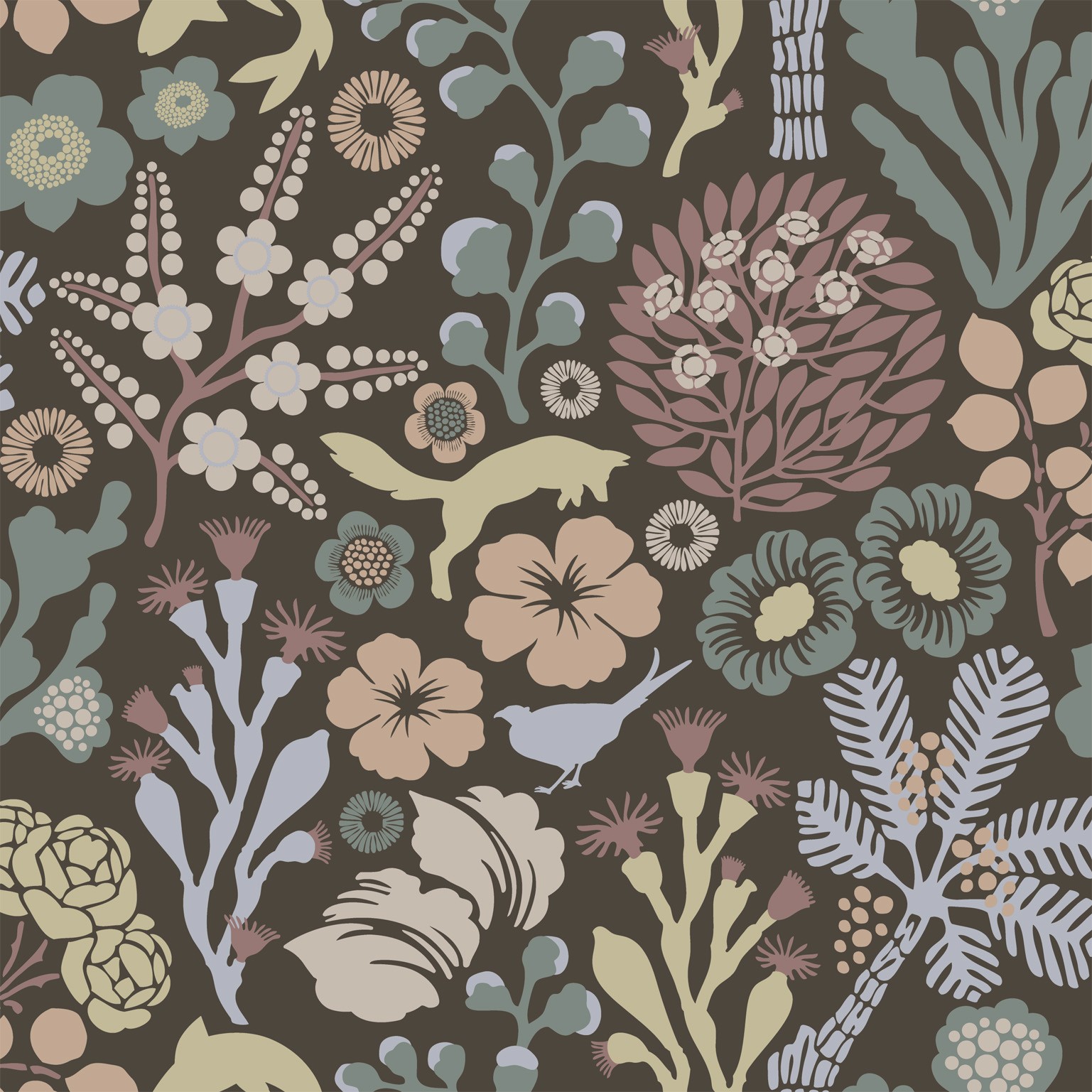 Description: A brown and blue floral pattern with flowers and leaves on it.