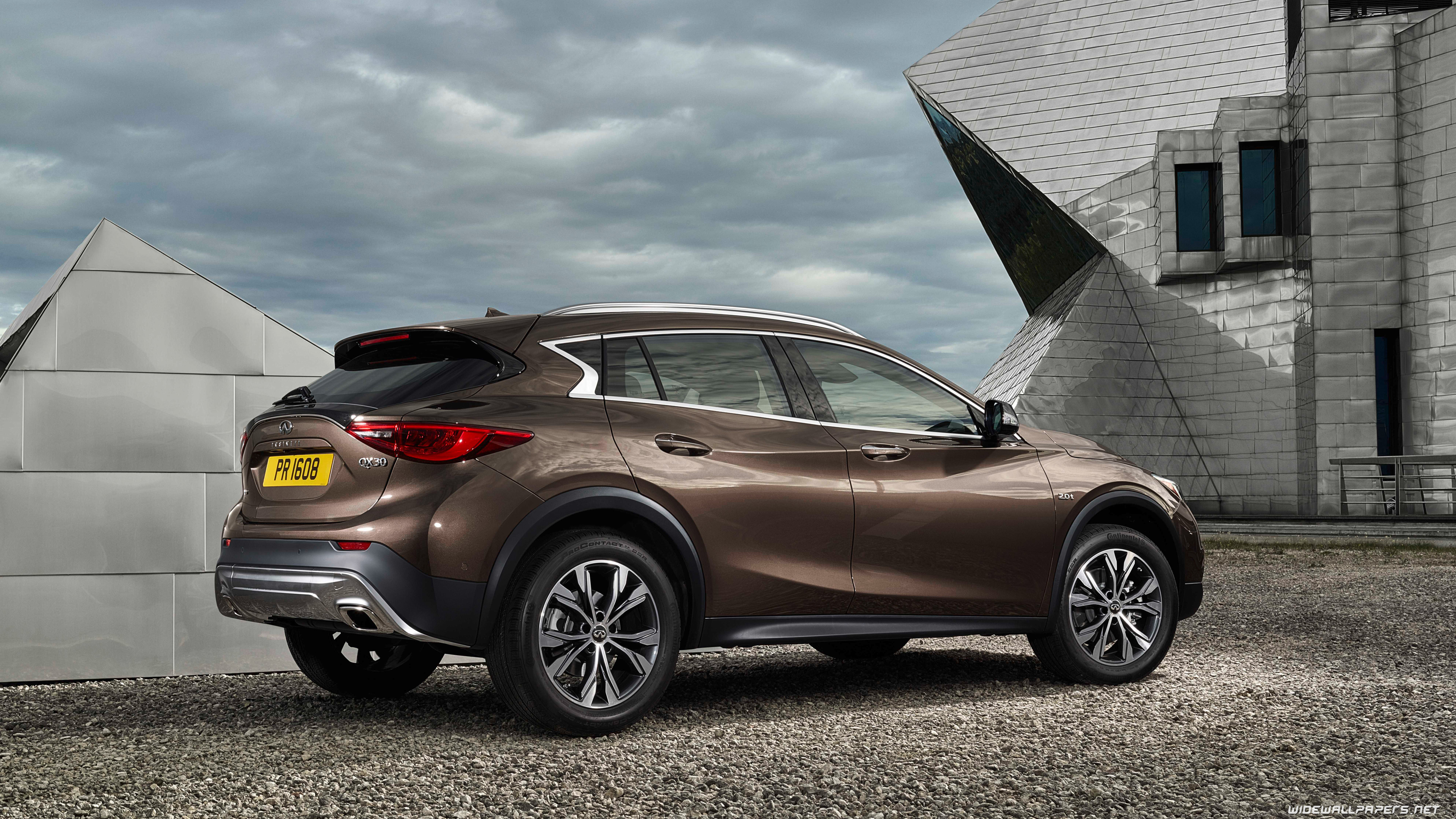Description: A brown car parked in front of a building with a large window and a door on the side of it.