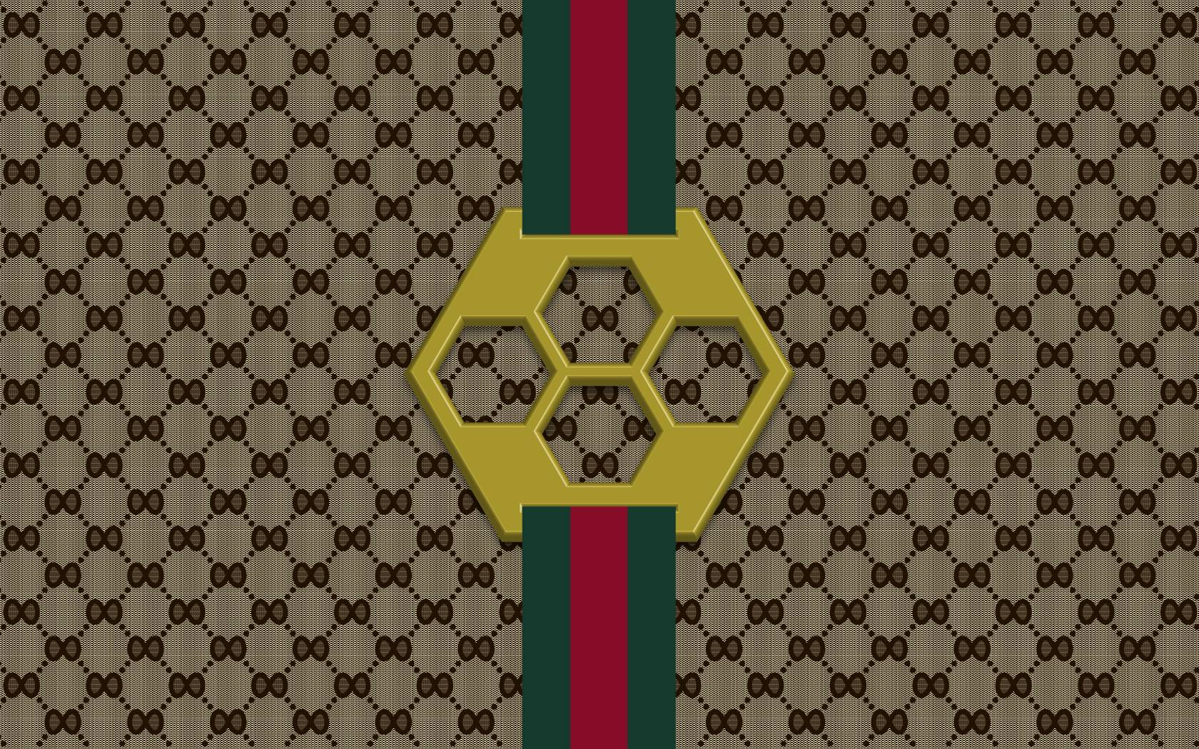 Description: A brown and green wall with a pattern on it and a gold object on the bottom of the wall.