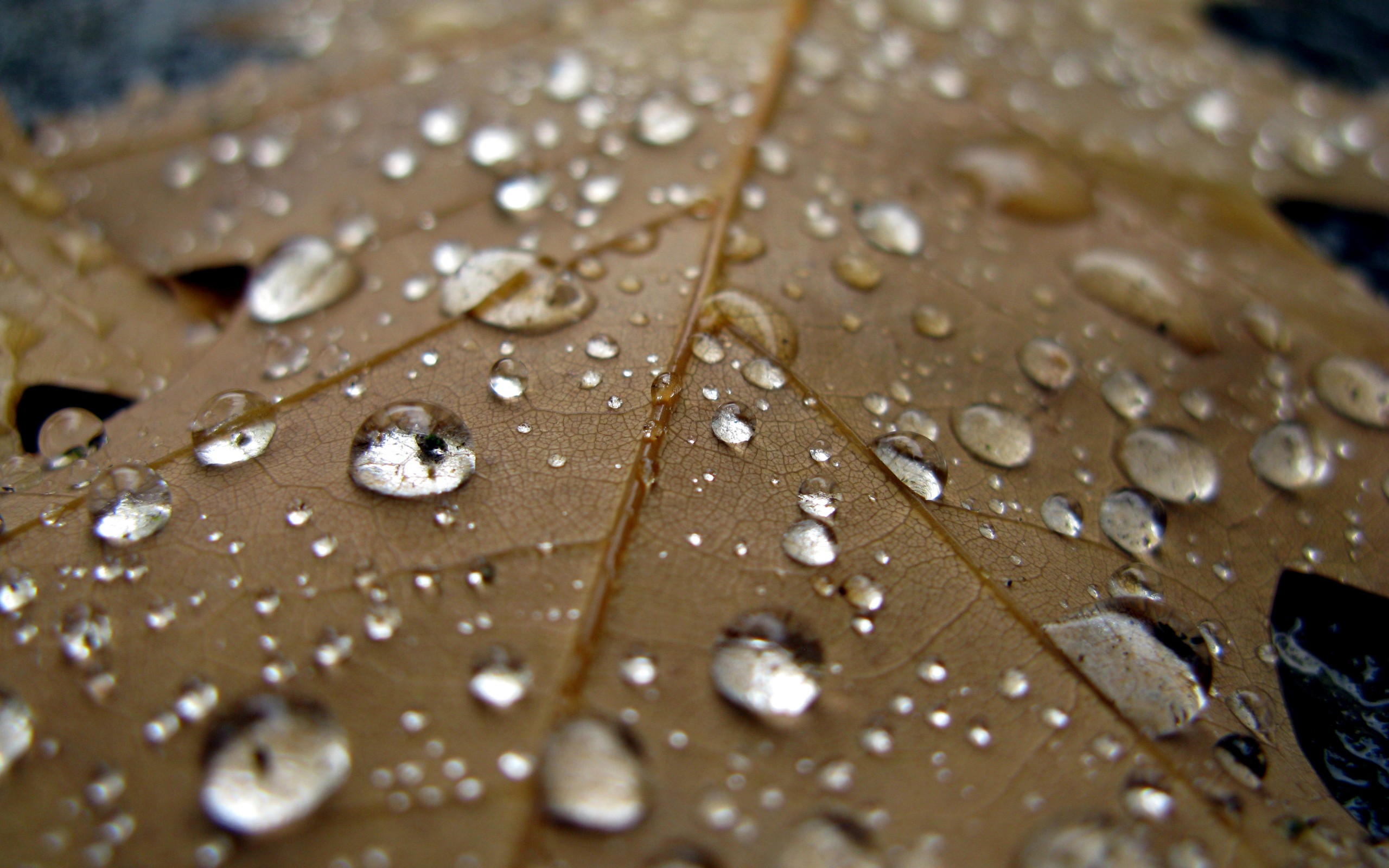Description: A leaf with water drops on it is shown in close up view of the leaves and the leaves are brown.