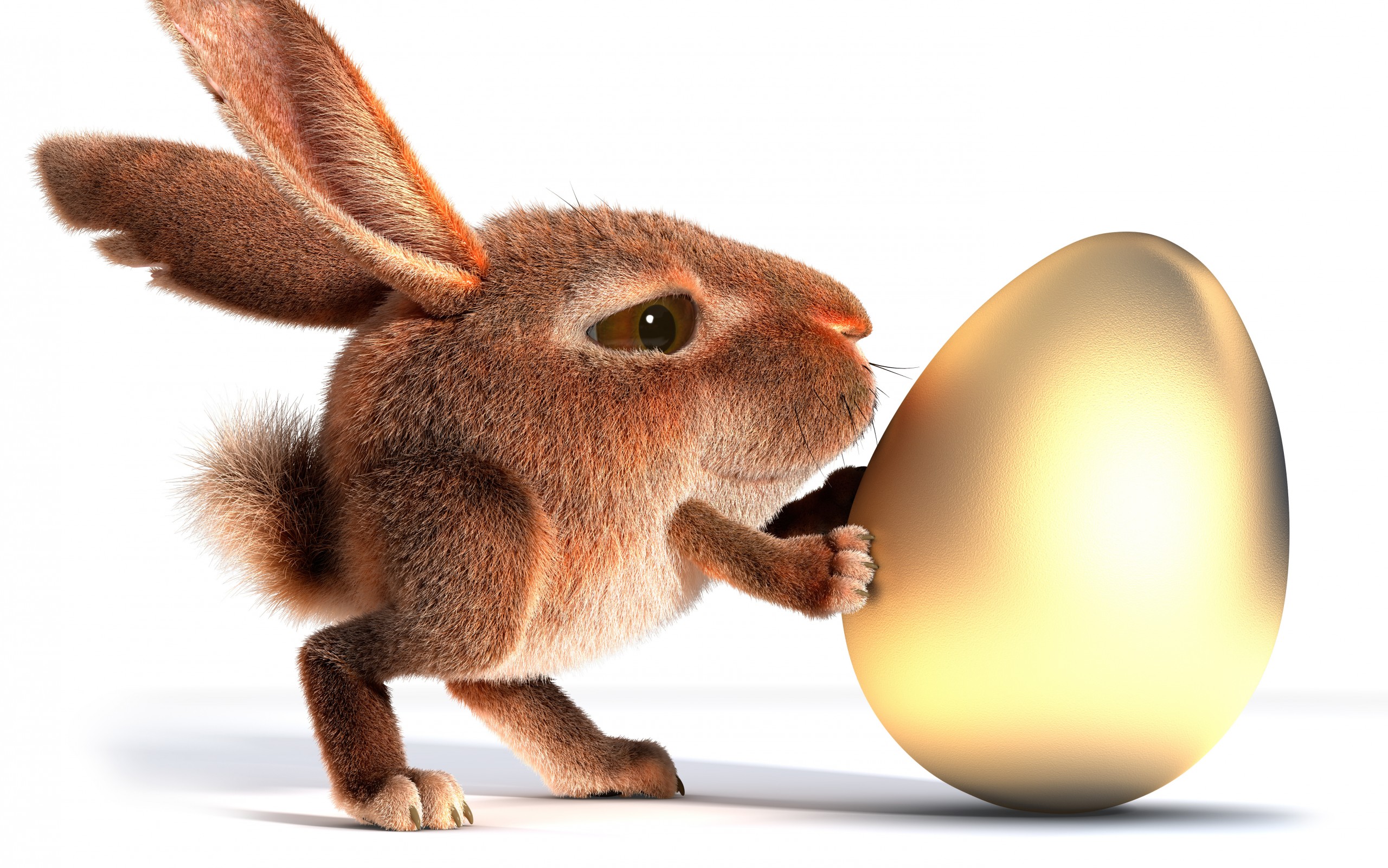 Description: A brown rabbit is holding an egg in its paws and looking at it with a surprised look on its face.