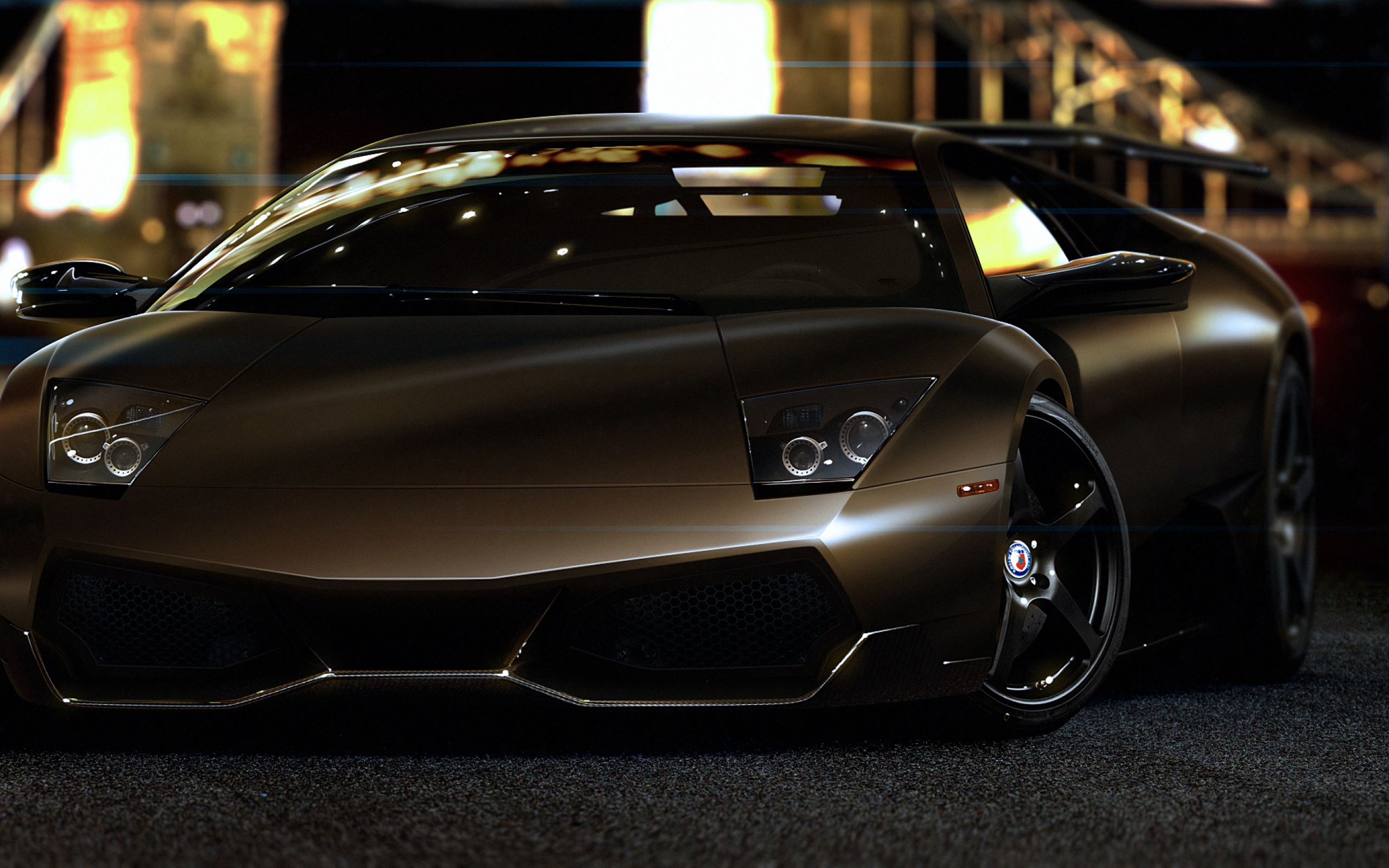 Description: A brown sports car parked in a parking lot at night time with a city in the background and a lit up building.