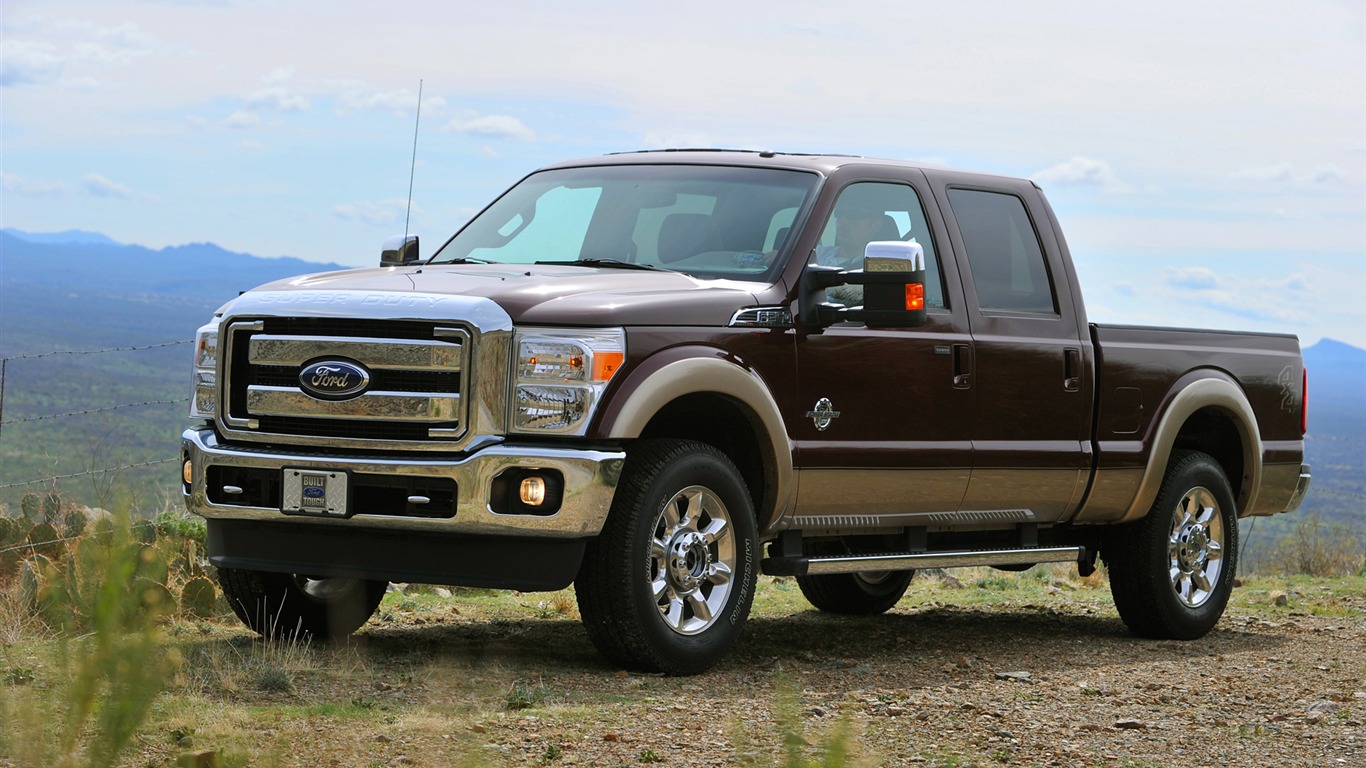 Description: A brown truck parked on a dirt road in the mountains with mountains in the background and a sky with clouds.