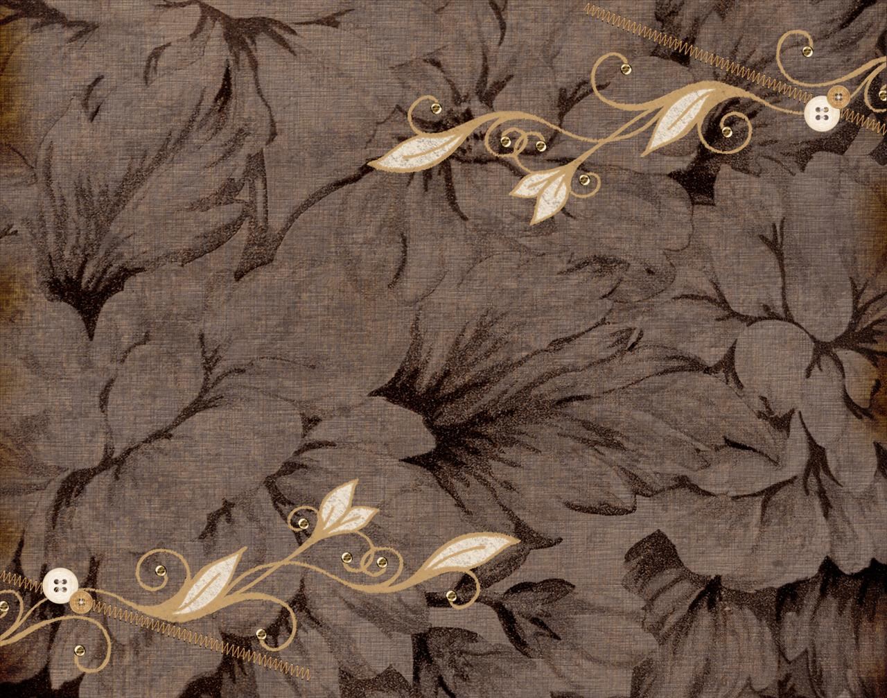 Description: A brown and white flower pattern on a fabric background with gold accents and a black background with white flowers.