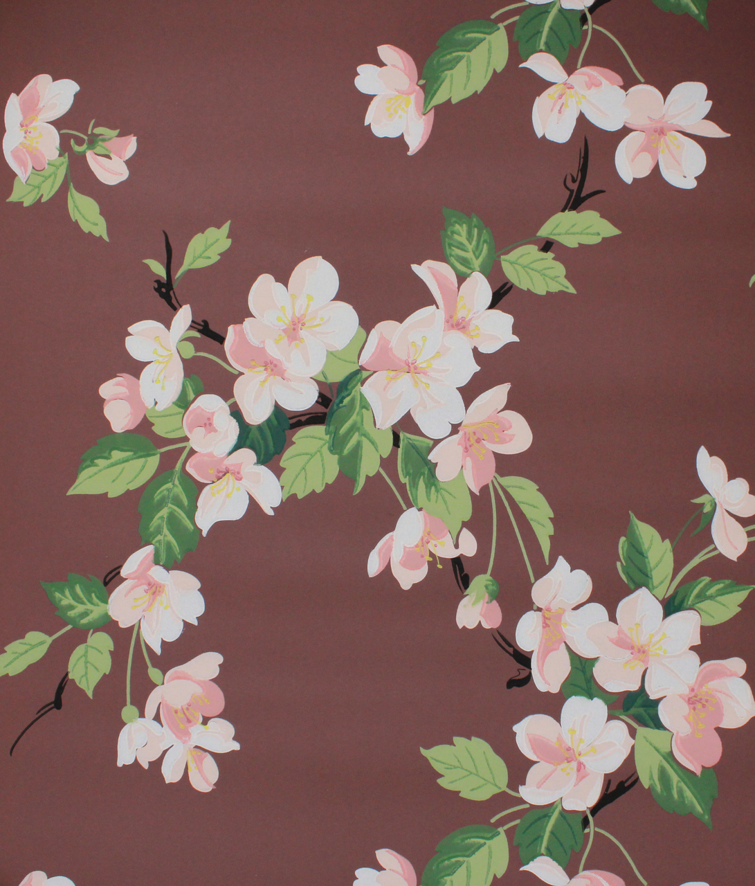 Description: A wallpaper with a flower pattern on it and a brown background with white flowers on it and green leaves.