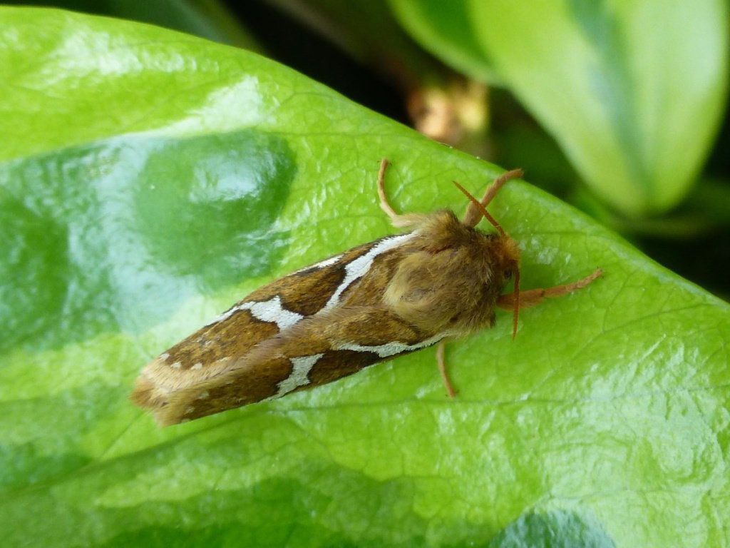 Description: A brown and white moth sitting on a green leaf in the sun on a sunny day in the garden.