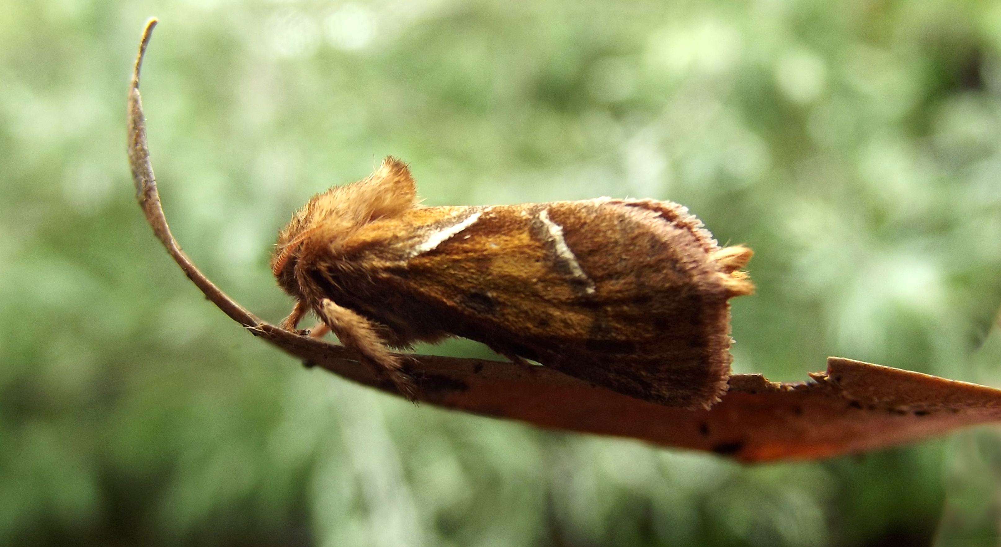 Description: A brown and white moth sitting on a leaf in front of a forest background with green leaves and a blurry background.