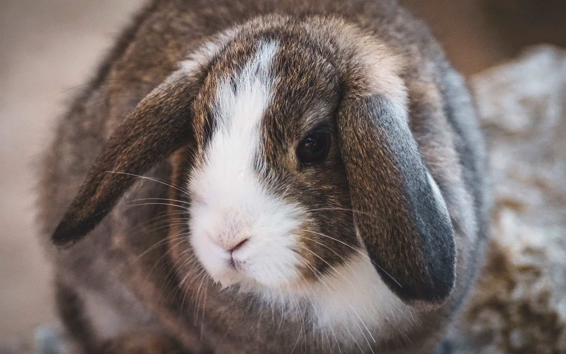Description: A brown and white rabbit sitting on top of a rock wall next to a rock wall and looking at the camera.
