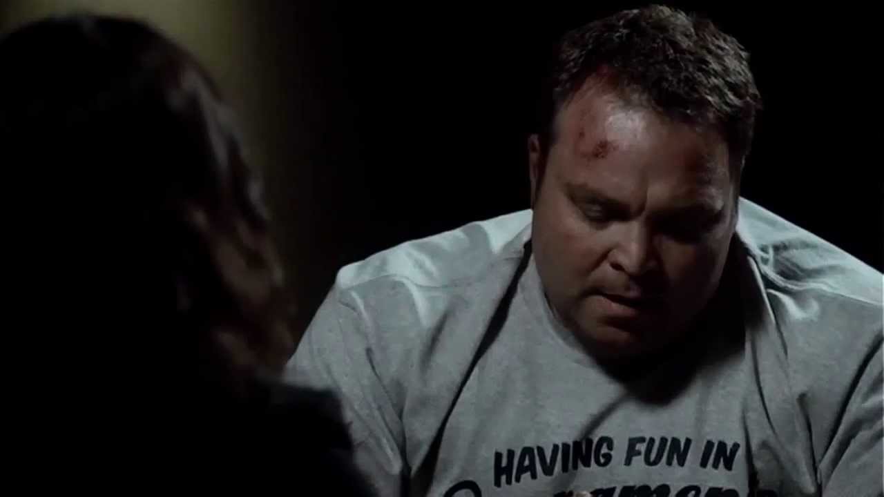 Description: A man with a bruised face and a woman with a black hair and a gray shirt are facing him.