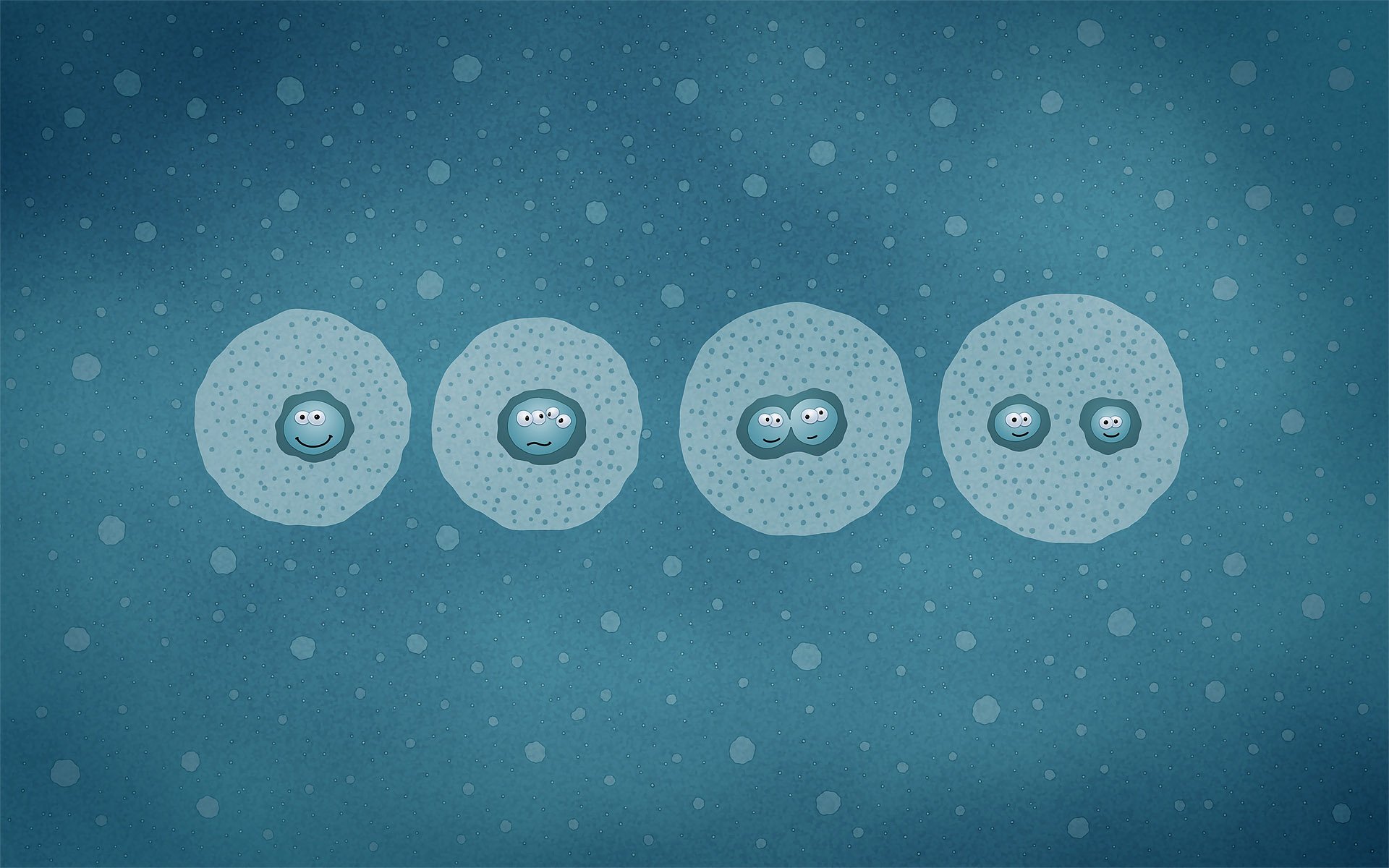 Description: A group of four bubbles floating in the air next to each other on a blue background with bubbles floating in the air.