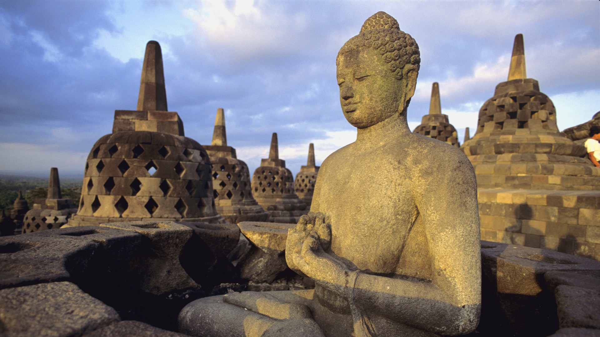 Description: A statue of a buddha sitting in front of a group of buildings with a sky background and clouds in the sky.