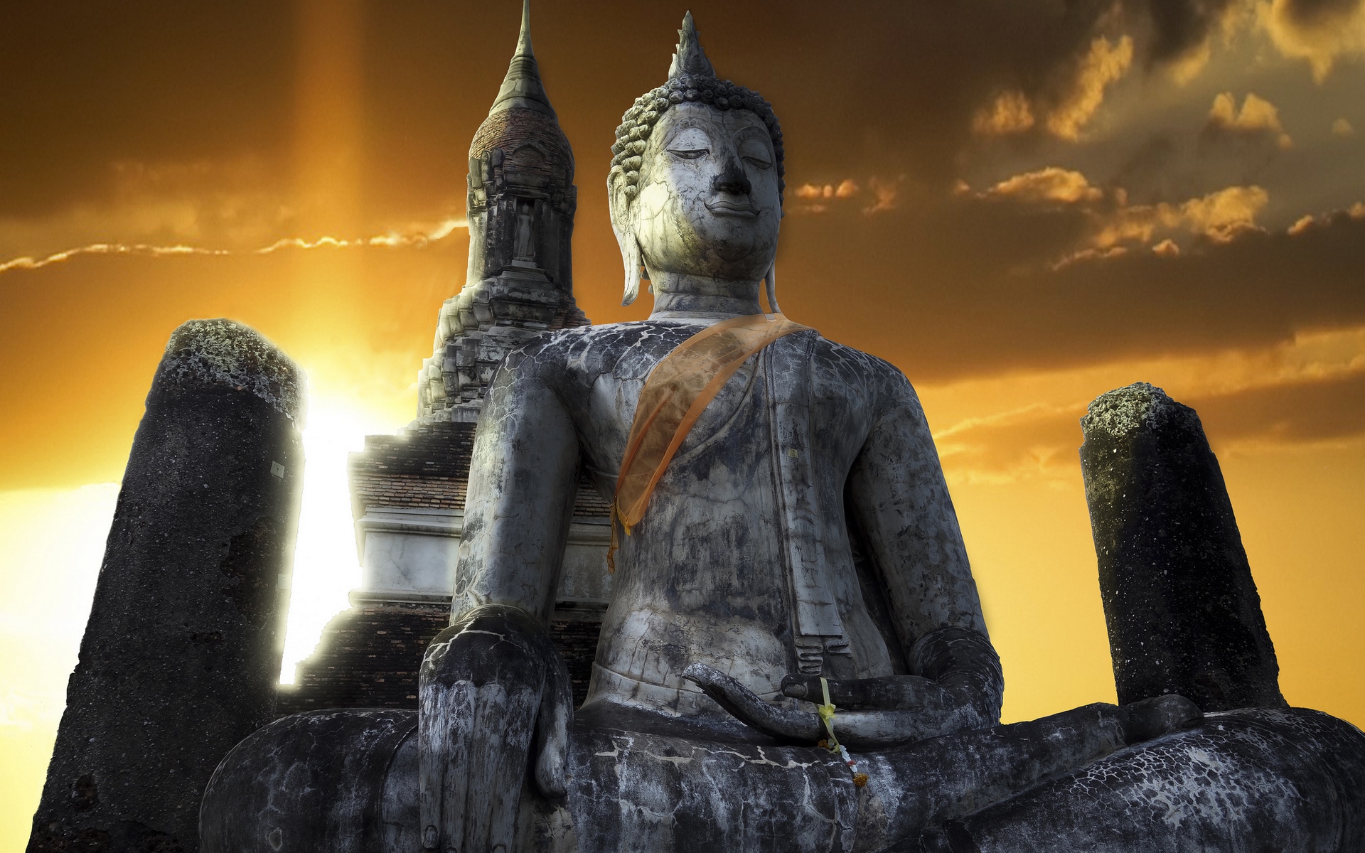 Description: A statue of a buddha sitting in front of a sunset sky with a building in the background and a sunbeam.