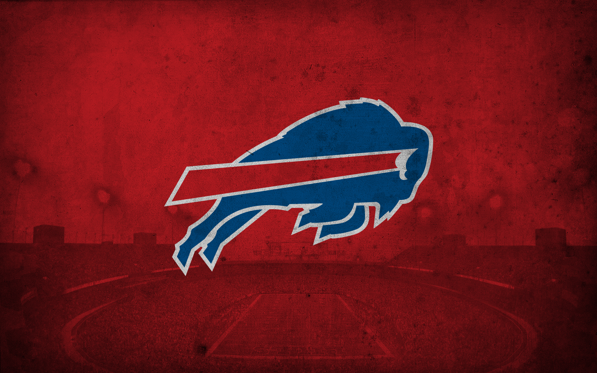 Description: A buffalo logo on a red background with a blue background and a red field in the background with a basketball court.