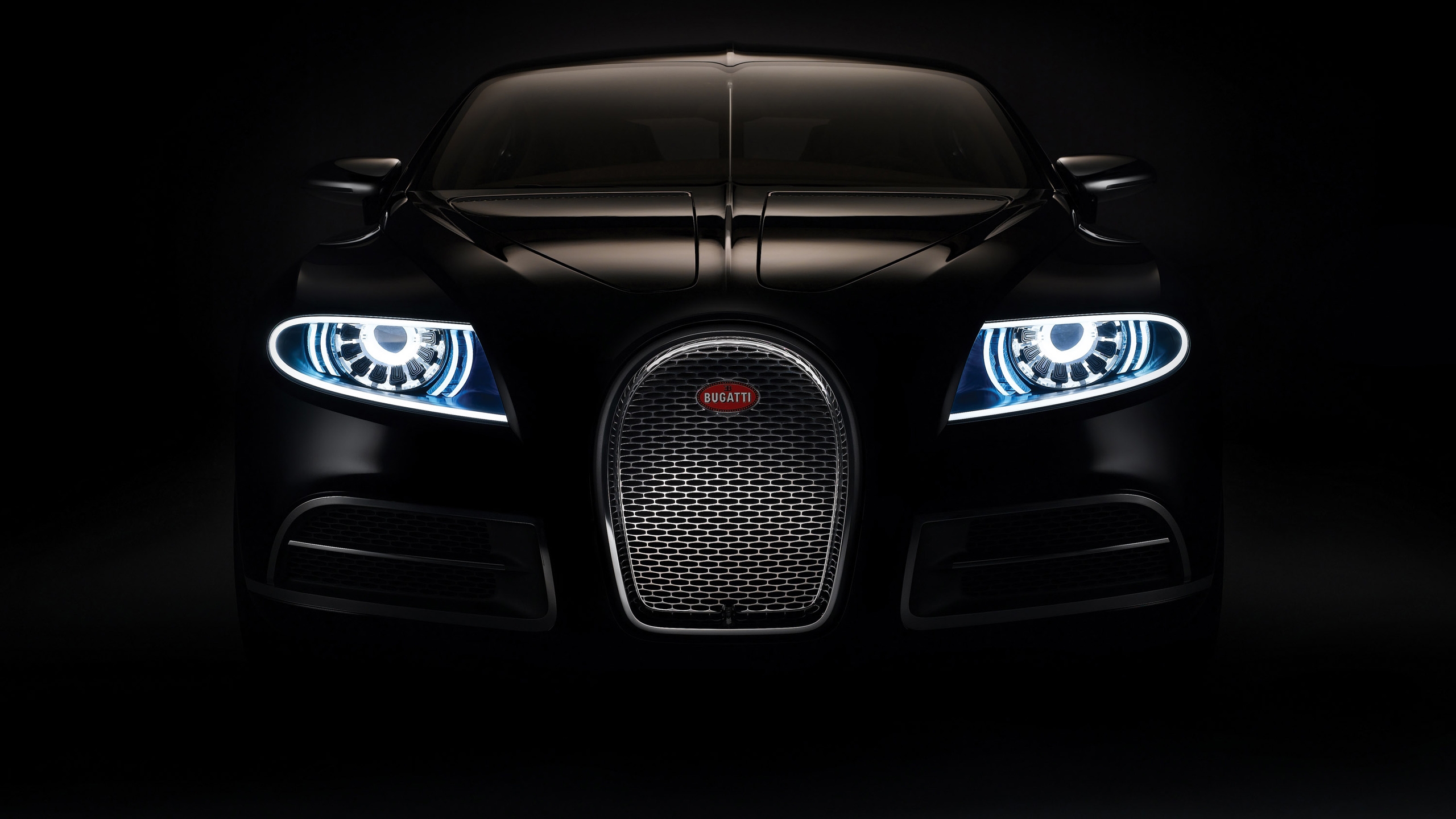 Description: A bugatti car is shown in the dark with its headlights on and the headlights on the front.