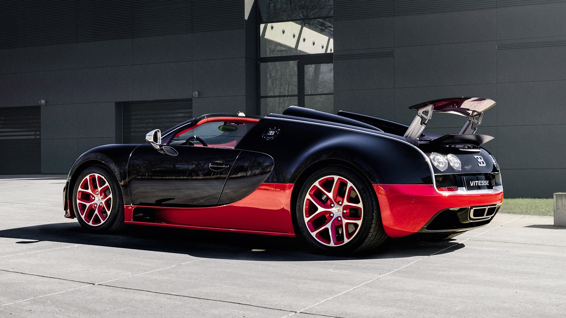 Description: A bugatti type car parked in front of a building with its doors open and the hood up.
