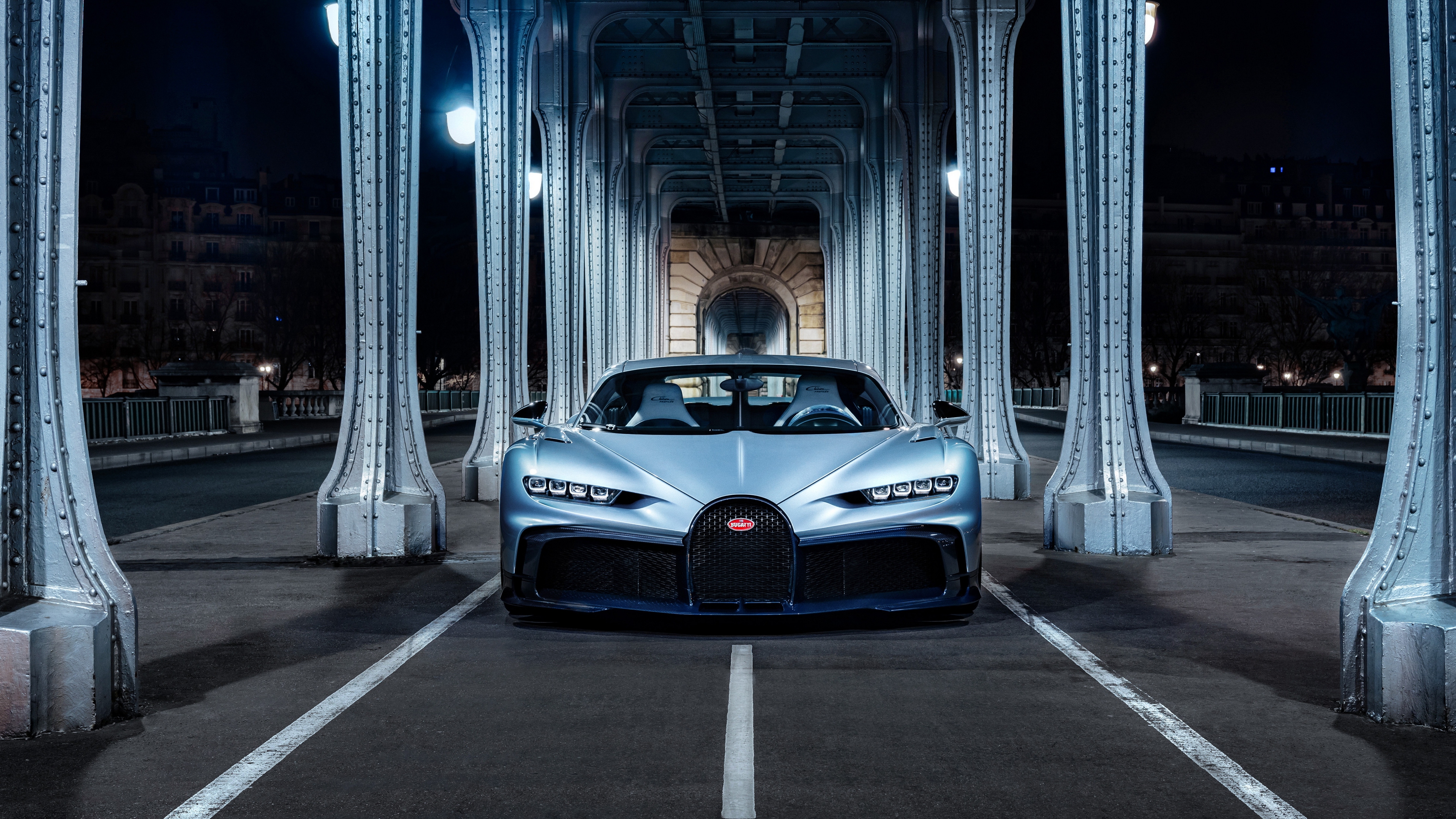 Description: A bugatti car is parked in a parking lot at night time with lights on the side of the car.