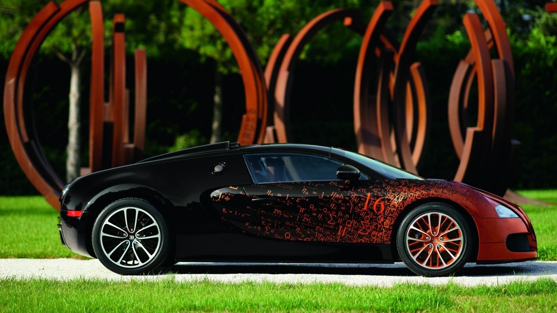 Description: A bugatti car parked in front of a sculpture of circles and trees in a park area with grass.
