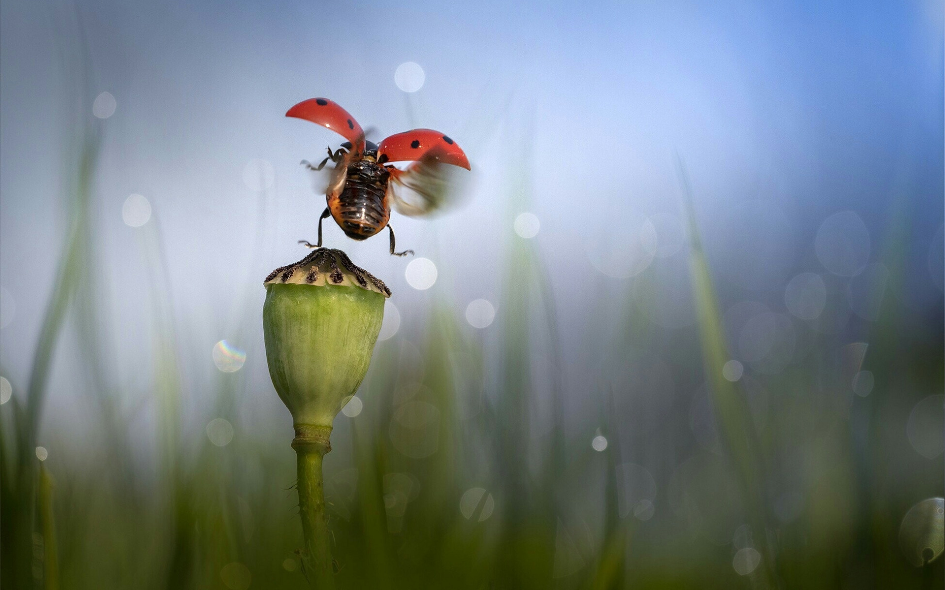 Description: A couple of bugs on top of a flower in the grass with water droplets on the background of the photo.