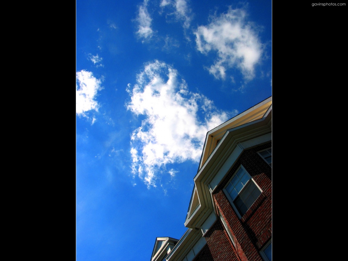 Description: A building with a clock on the side of it and a sky background with clouds in the sky above.