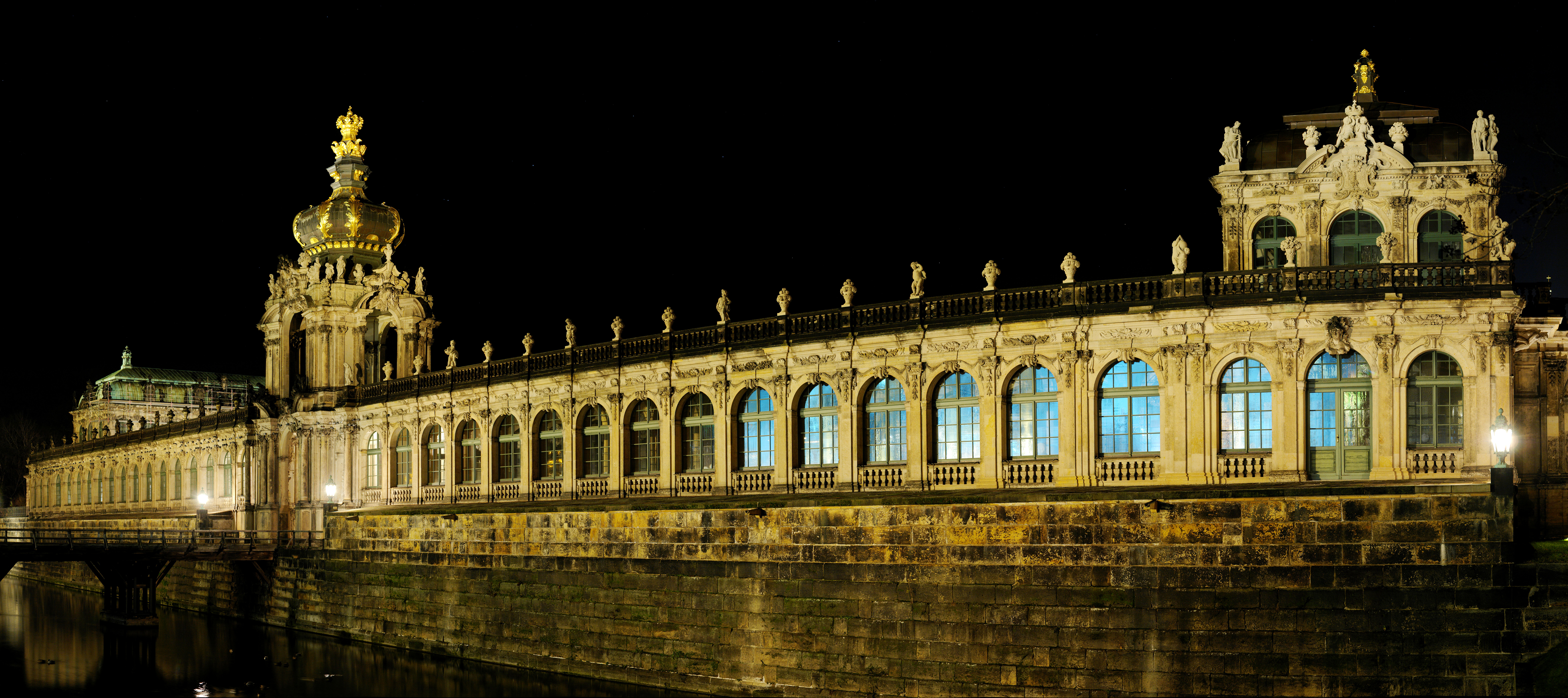 Description: A building with a clock tower and a bridge over water at night time with lights on the windows and a bridge in the foreground.