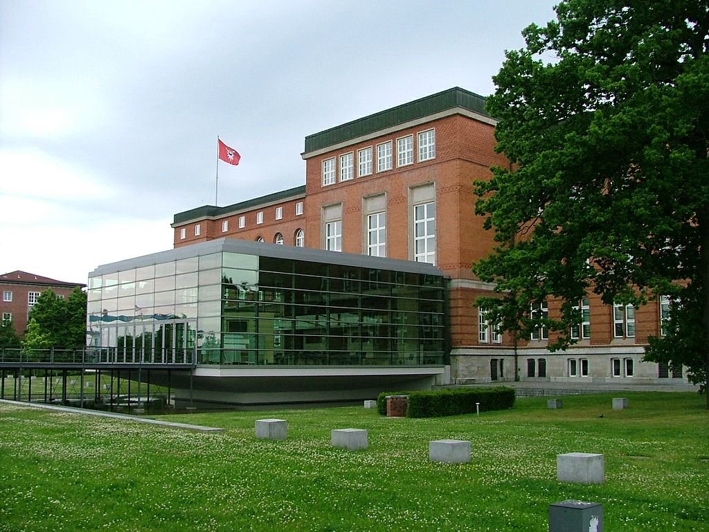 Description: A building with a flag on top of it next to a grassy field with trees and bushes in front of it.