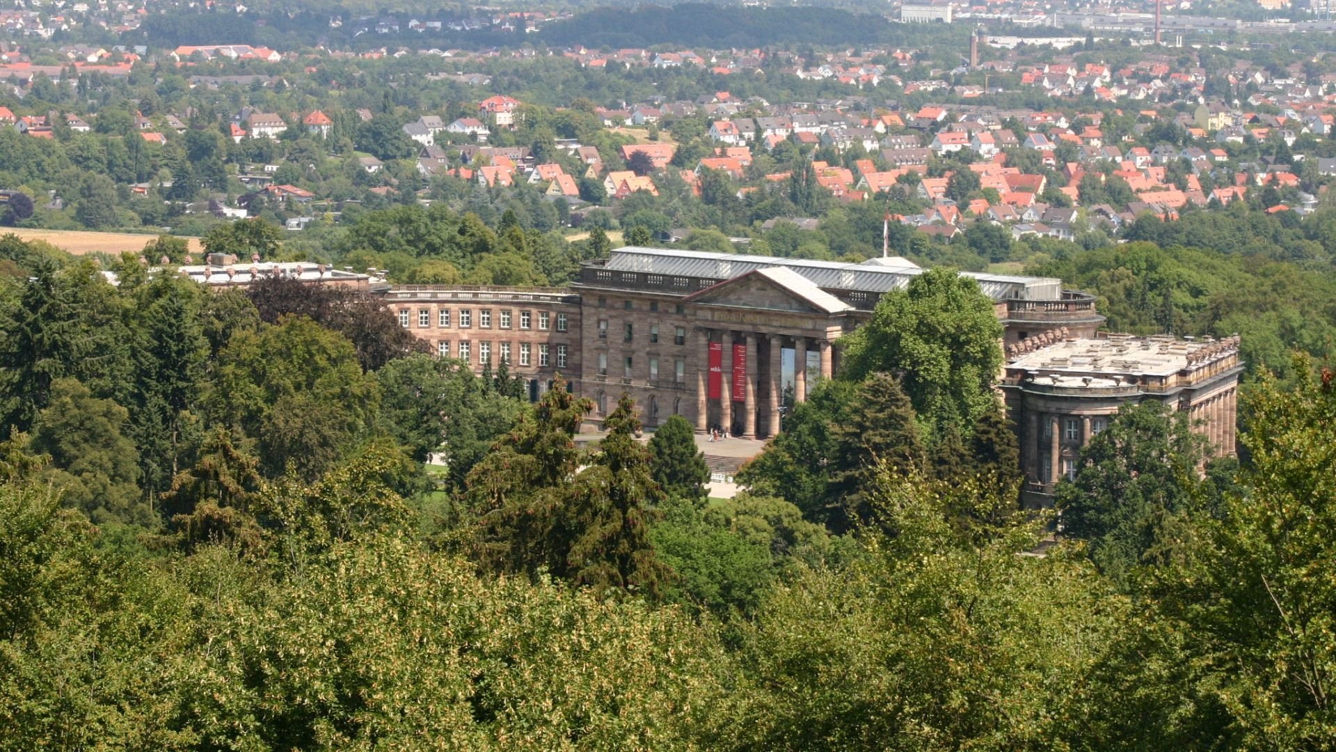 Description: A building in the middle of a forest with a city in the background and trees in the foreground.