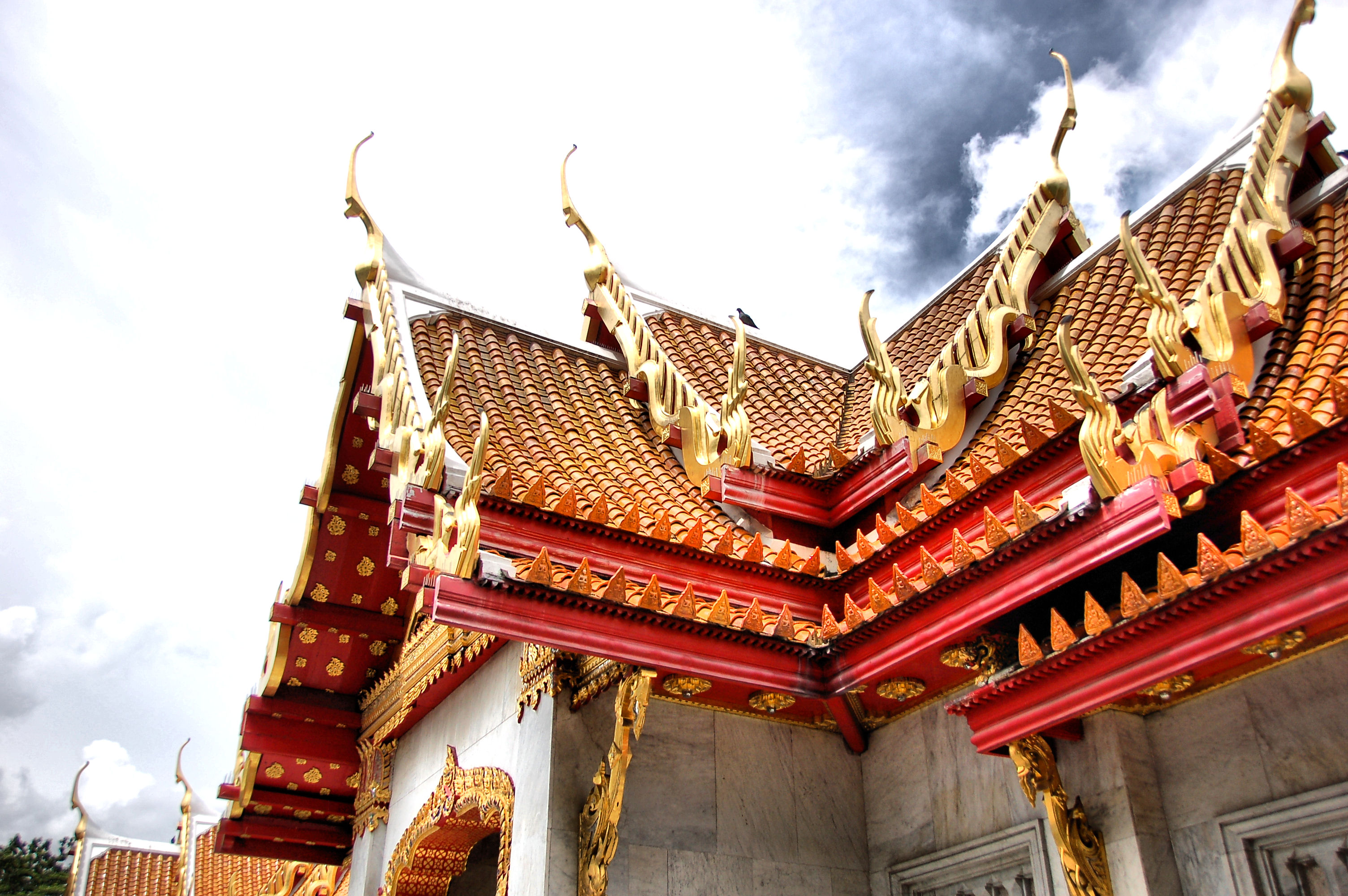 Description: A building with a red roof and gold decorations on it's roof and a cloudy sky in the background.