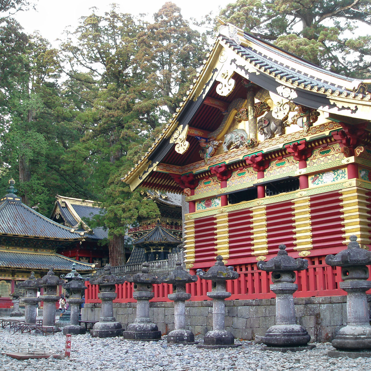 Description: A building with a red and yellow roof and a red fence around it and a few trees in the background.