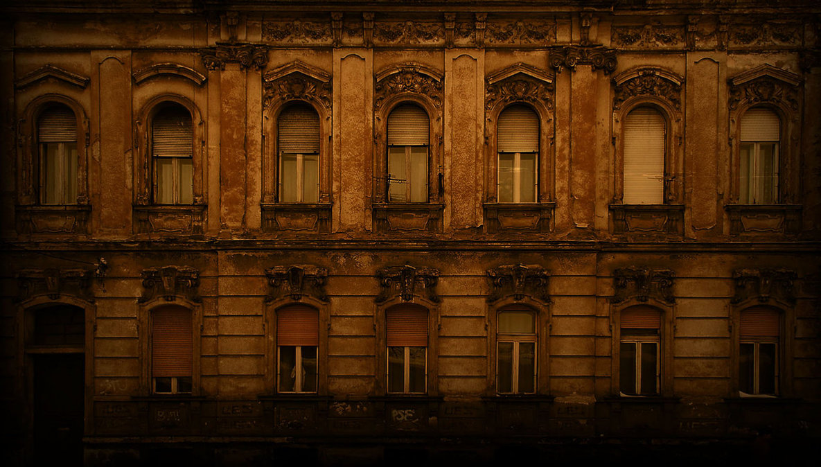 Description: A building with windows and a clock on the front of it's face and a clock on the side of the building.